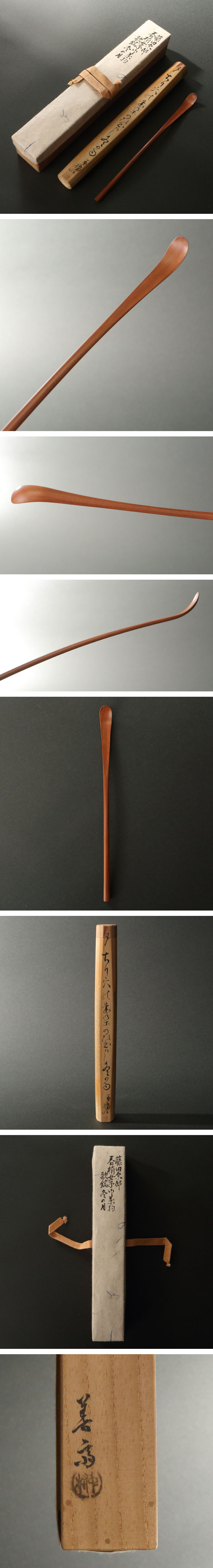 藤田春梢女の木地茶杓です。 「ちり穴の歯朶のび出まし冬の月」と句銘を附した茶杓です。京都の指物師・中村善斎の下削に成ります。 春梢女は新町三井家当主・三井高堅(源右衛門)の令妹(一説に養妹)であり、藤田伝三郎の二男・徳次郎(耕雪)の後室となりました。夫婦ともに高浜虚子の門人であったことが知られます。息子藤田光一が藤田男爵家を継いだため、耕雪の没後は女戸主として家督を継ぎました。 清浄を第一とする露地の塵穴に歯朶が生える様は、亭主を失った茶室を想像させ、恐らくは耕雪没後の句とみられます。冷え枯れた俳趣の逸品です。 共筒・共箱が付属します。某数寄者研究者の旧蔵品です。 ◆藤田春梢女 戦前期の俳人。本名は治子(治)。新町三井家・三井高堅(源右衛門)の妹で、藤田伝三郎の長男徳次郎(耕雪)の後妻。昭和10(1935)年耕雪の没後家督を継ぐ。俳句は耕雪と同じく虚子門で『ホトトギス』同人。 ◆中村善斎 戦前期の指物師。昭和初期(1930年代)に京都で活動。主に京都選匠会で活躍した。 付属:共筒・共箱が付属します。 寸法:長さ18.5cm(最大幅。若干の誤差はご了承下さい) 状態:経年感がございます。 |