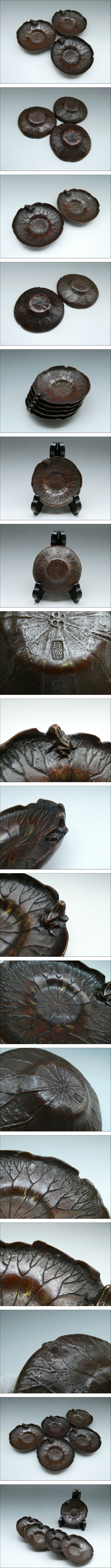 | ★商品★ ・蓮葉形蛙文茶托 (五客揃) ★銘★ ・琢斎 ★寸法★ ・直径 (約)10cm ・高さ (約)2.5cm ★重量★ ・(約)825g ※五客すべてを合わせた重量 ★材質★ ・銅製 ★状態★ ・経年による多少の傷、汚れ、変色が見られます。 ※備考※ 商品状態に関しては、あくまでも当方の見立てとなります。 程度には個人差がございますので、商品画像を良くご覧になられた上でのご入札お待ちしております。 画像の台座は付属しません。 |