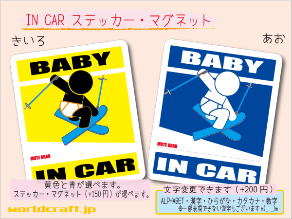 クルマのうしろにペタリとどうぞ!! ●サイズ : 縦 10.5cm × 横 9cm ●枚数 : 1枚 ■ 仕様選択 : ■ カラー選択 : 黄色 / 青 ☆仕様とカラー、それぞれどちらかひとつ お選びください☆ 画像1にはマグネット仕様+150円と書かれていますが、 このたびステッカーと同じ価格になりました☆ 現在マグネット仕様に追加料金はございません 落札後、取引ナビにて ご希望の仕様(ステッカー / マグネット)、ご希望カラー(黄色 / 青) をお知らせくださいませ ★ 耐久性UPしました ★ 耐水・耐候 屋外用塩ビシート仕様 ☆当店だけでしか買えないオリジナルデザイン☆ Made in JAPAN □ □ □ □ □ □ □ □ □ □ □ □ □ □ □ □ □ □ □ BABY IN CAR、BABY on BOARD、CHILD IN CAR、CHILD on BOARDバージョン、その他スノボバージョン、スケボーバージョン、野球バージョンなどなどいろんなバージョンいっぱい取りそろえております☆ ☆その他 出品中の○○ IN CAR ステッカーシリーズ☆ ・BABY IN CARステッカー ・CHILD IN CARステッカー ・○○ IN CARステッカー(大人バージョン) ☆もうひとつのオークションID i306st でも BABY CHILDステッカー出品中☆ BABY ・ CHILD ☆どうぞよろしくお願いいたします☆ ※お休みの連絡などある場合がございますので、ご入札前に必ず自己紹介欄をご覧くださいませ※