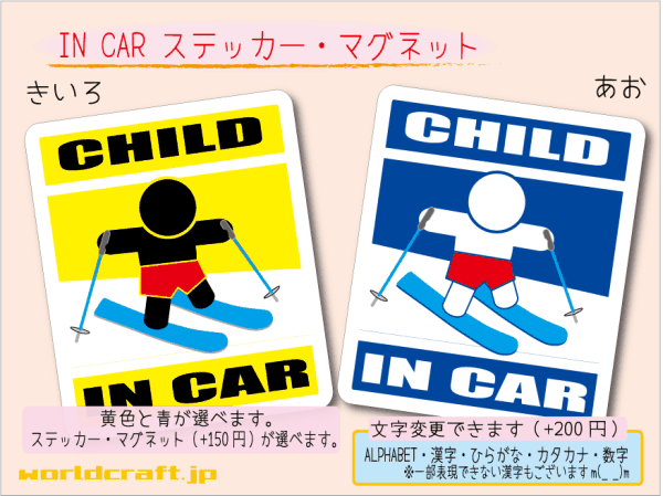クルマのうしろにペタリとどうぞ!! ●サイズ : 縦 10.5cm × 横 9cm ●枚数 : 1枚 ■ 仕様選択 : ■ カラー選択 : 黄色 / 青 ☆仕様とカラー、それぞれどちらかひとつ お選びください☆ 画像1にはマグネット仕様+150円と書かれていますが、 このたびステッカーと同じ価格になりました☆ 現在マグネット仕様に追加料金はございません 落札後、取引ナビにて ご希望の仕様(ステッカー / マグネット)、ご希望カラー(黄色 / 青) をお知らせくださいませ ★ 耐久性UPしました ★ 耐水・耐候 屋外用塩ビシート仕様 ☆当店だけでしか買えないオリジナルデザイン☆ Made in JAPAN □ □ □ □ □ □ □ □ □ □ □ □ □ □ □ □ □ □ □ BABY IN CAR、BABY on BOARD、CHILD IN CAR、CHILD on BOARDバージョン、その他スノボバージョン、スケボーバージョン、野球バージョンなどなどいろんなバージョンいっぱい取りそろえております☆ ☆その他 出品中の○○ IN CAR ステッカーシリーズ☆ ・BABY IN CARステッカー ・CHILD IN CARステッカー ・○○ IN CARステッカー(大人バージョン) ☆もうひとつのオークションID i306st でも BABY CHILDステッカー出品中☆ BABY ・ CHILD ☆どうぞよろしくお願いいたします☆ ※お休みの連絡などある場合がございますので、ご入札前に必ず自己紹介欄をご覧くださいませ※