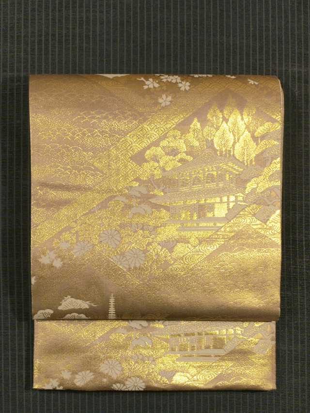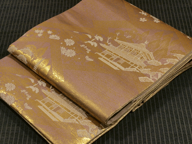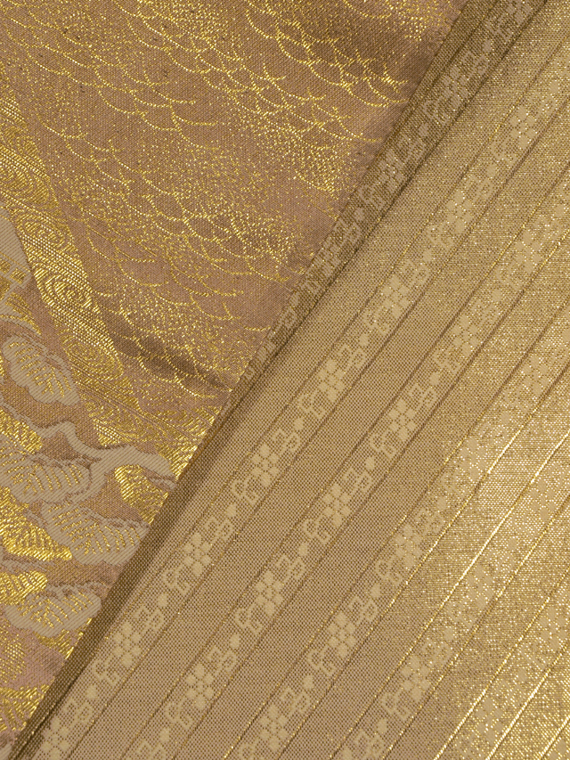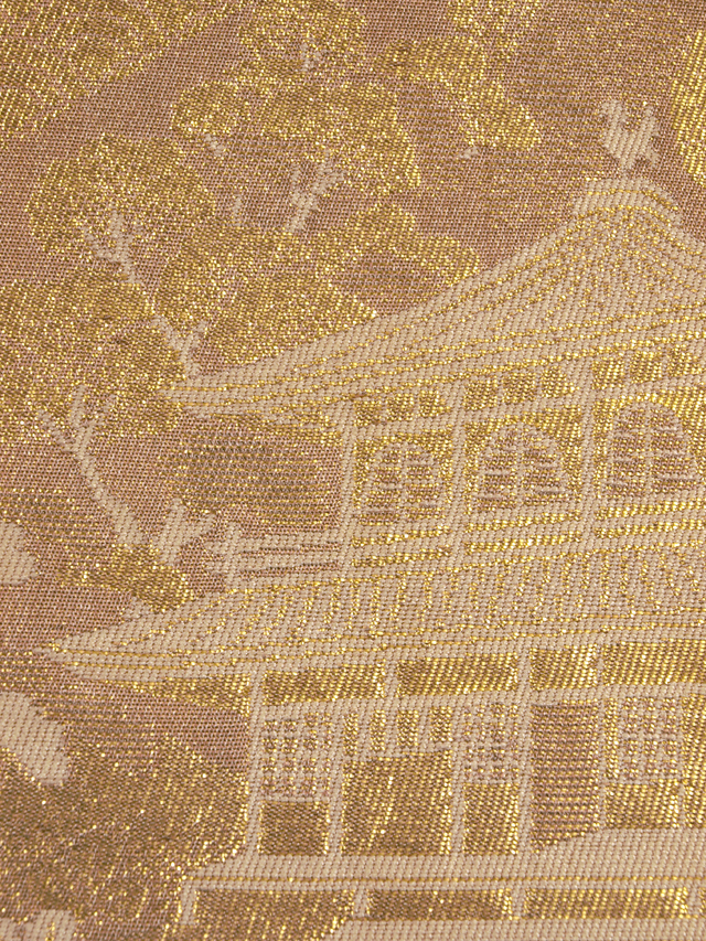 全体的な印象としては紅藤色がかった薄金色の地に、青海波(せいがいは)や観世水(かんぜみず)などの小紋が輪郭に配された松皮菱と銀閣寺や法隆寺五重塔などの洛東(らくとう)の景勝の文様が織り込まれている、西陣織の袋帯です。京都・西陣の老舗の織元「久保坂織物」さんで製作されたお品で、たれの折り返し内側に西陣織物工業組合の証紙「2266 」が付いています。 京都・東山文化を象徴する銀閣寺と五重塔が切り絵のように浮かび上がります。見る角度によって地色が沈んだ紅藤色から薄金色に玉虫のように変わる、品の良いかわいらしさの感じられるお色目です。胴回りの柄抜き部分には唐花二重亀甲、裏面はななめ縞に花の地紋が織り出されている、豪奢なつくりになっています。 未使用保管品です。帯芯は入れられておらず、帯端の折り返しの綴じもない状態ですが、このままお使いいただいてもかまいません。もちろん帯芯を入れてお仕立てすることもできます。保管上のごくごくこまかな箔糸の凹みがちらほらと若干ありますが、とくに気になるようなものではなく、そのほかに目につくしみやよごれなどのダメージもなく、たいへんきれいな状態です。 |