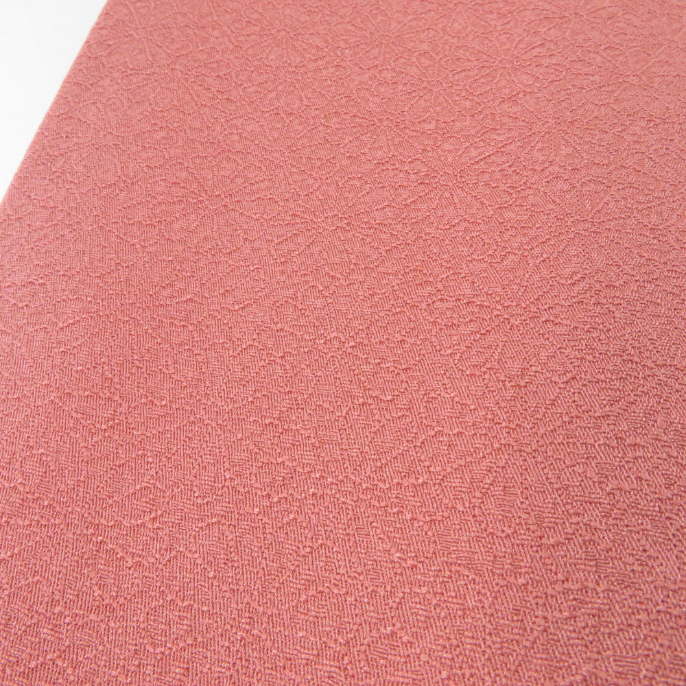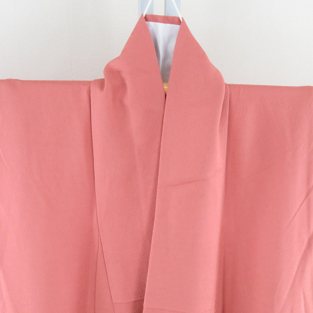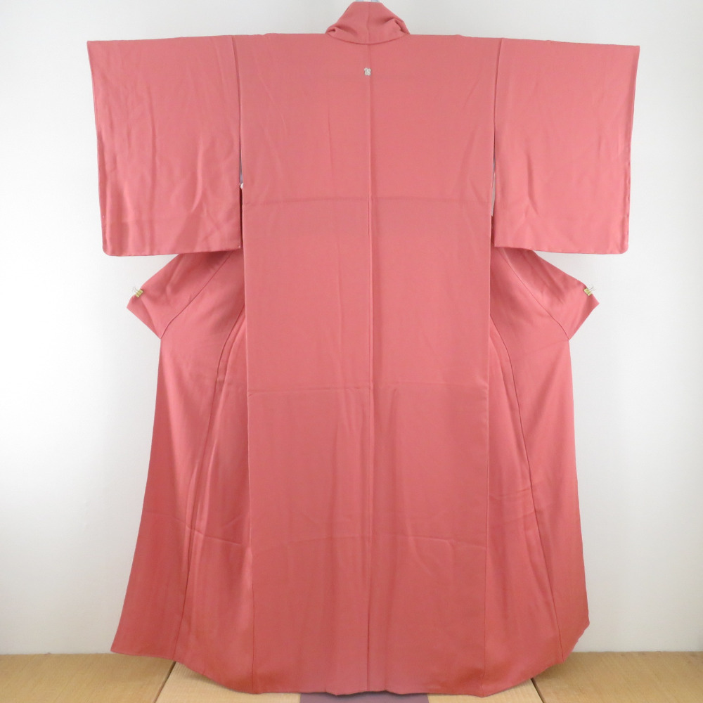 | 色無地 袷 広衿 桃橙色 菊地紋 正絹 一つ紋 違い鷹の羽紋 仕立て上がり着物 身丈155cm |