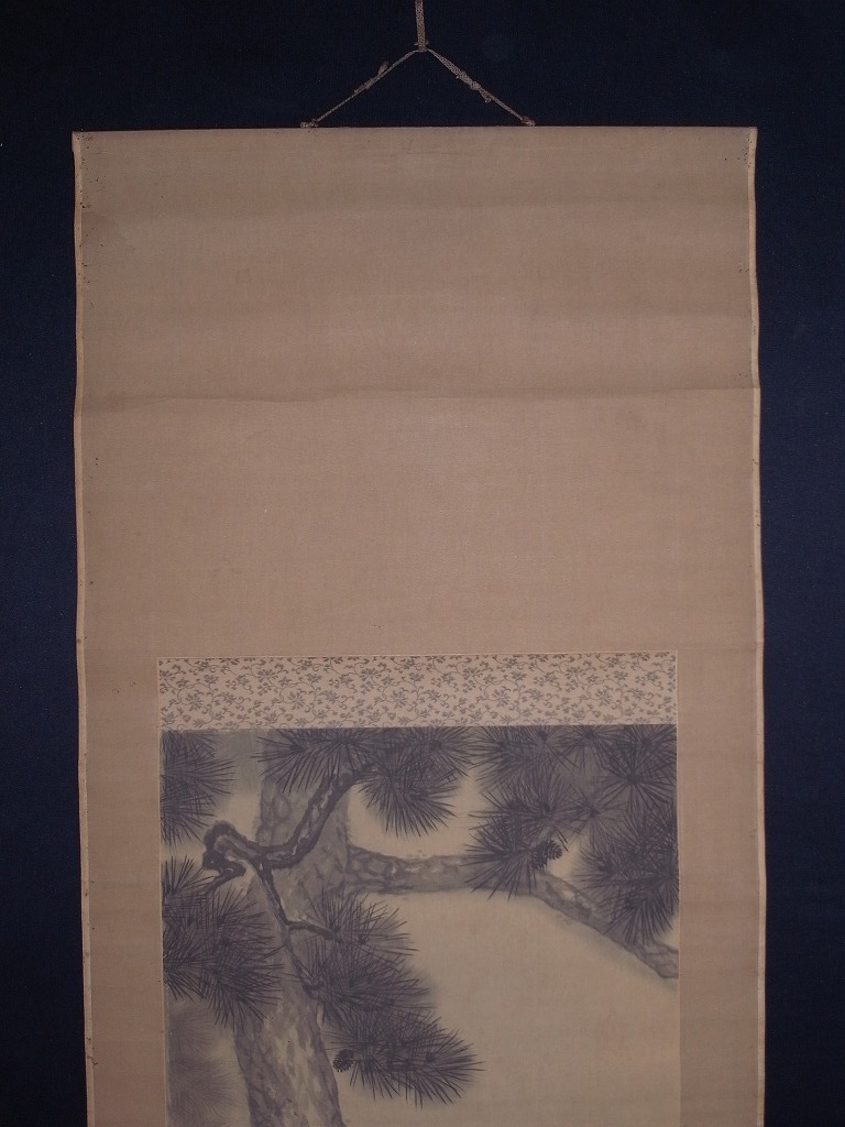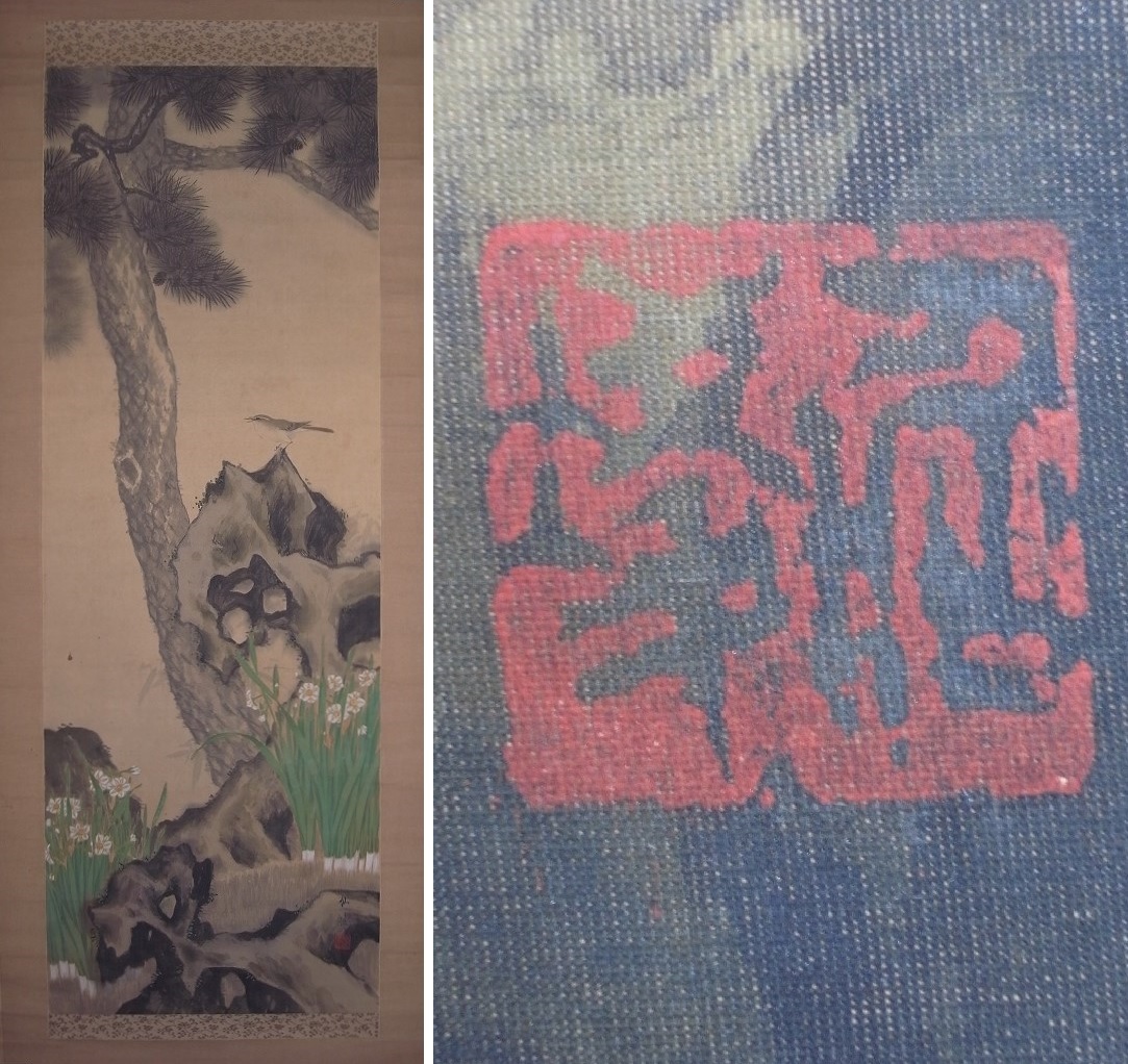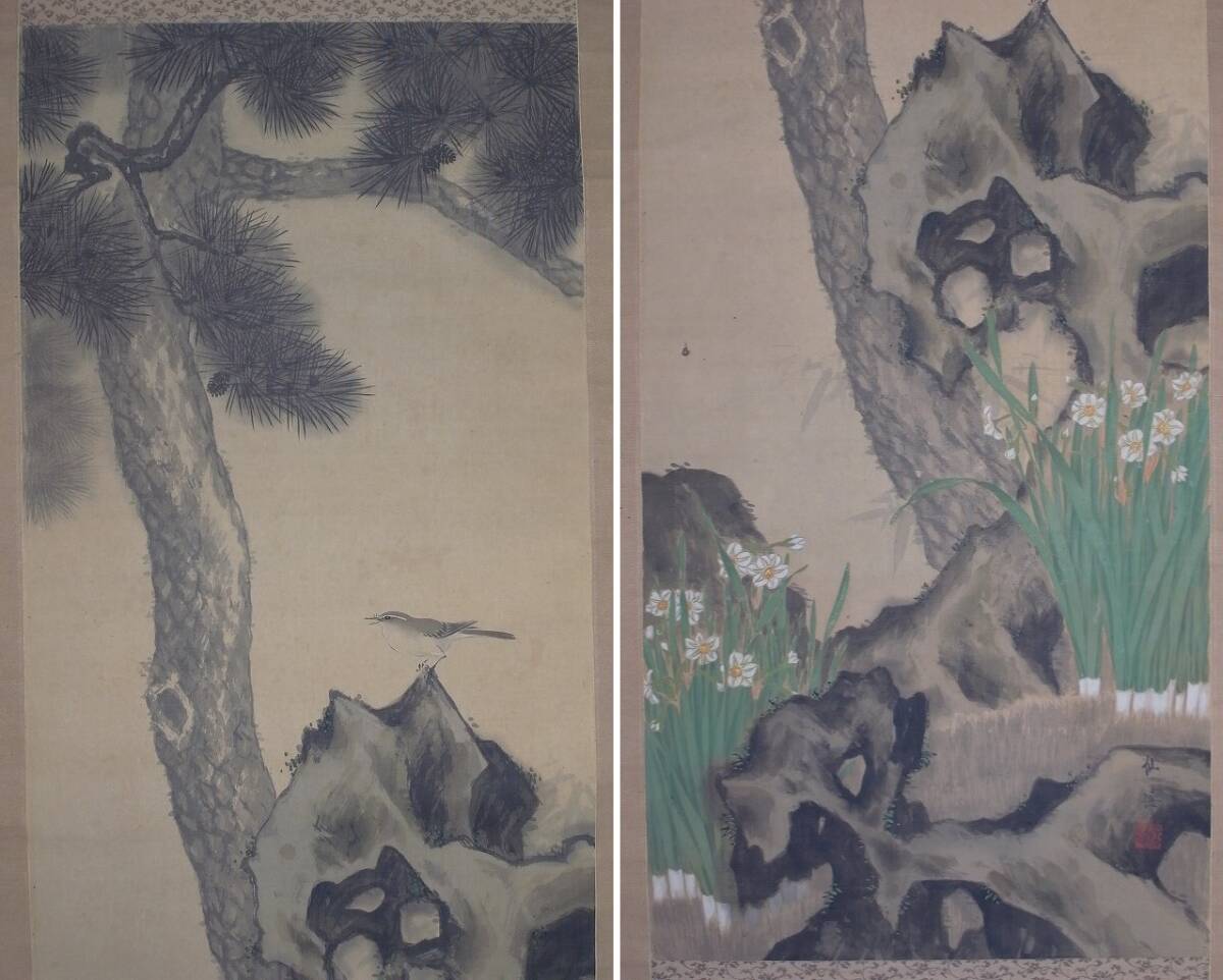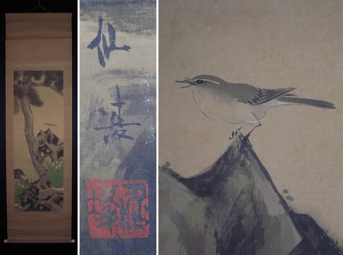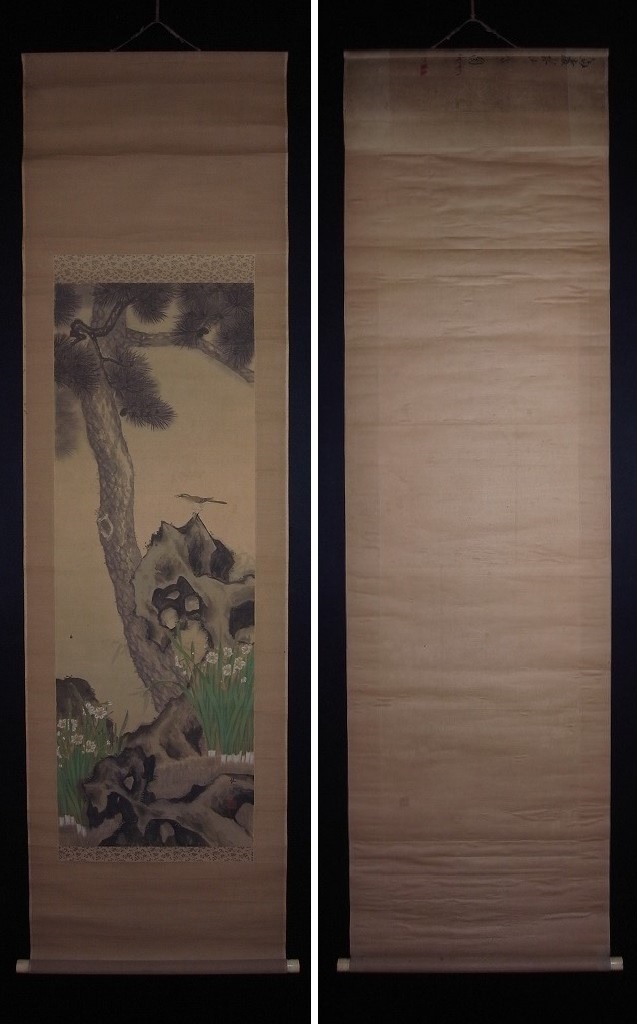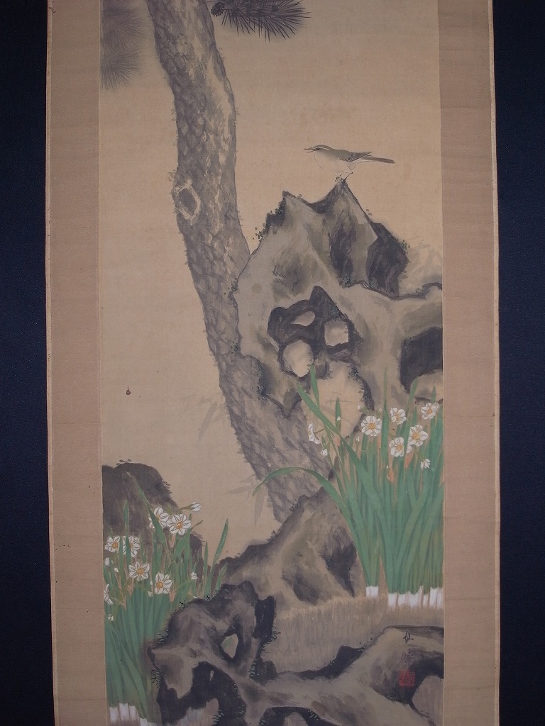 ◇出品物紹介西宮仙凌『松と水仙と鶯の圖』掛軸〔絹本肉筆真作〕でございます。