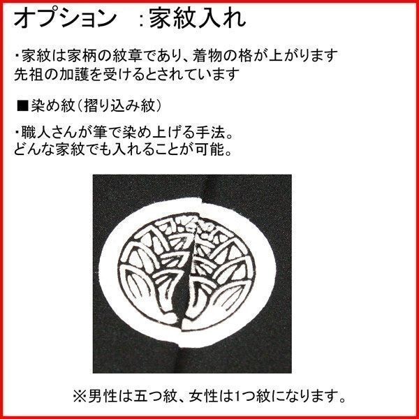 | 紋入れ | ・紋入れ可能です。 ■羽織のみ:別途6600円 ■羽織・着物:別途¥13200(¥6600×2) にて承ります。 6~8日間ほどお時間をいただきます。 ※家紋は染め紋(摺り込み紋)になります。 ※五つ紋の価格です ※紋入れをご要望の場合は、家紋名をフォーム備考欄にご明記ください ※ご希望のお客様は、「フォーム備考欄」「メール(aji_net@khaki.plala.or.jp)」「お電話」「FAX」いずれかの方法でご連絡ください。 ご注文内容確認後、当店より合計金額をメールにてお知らせ致します。 |