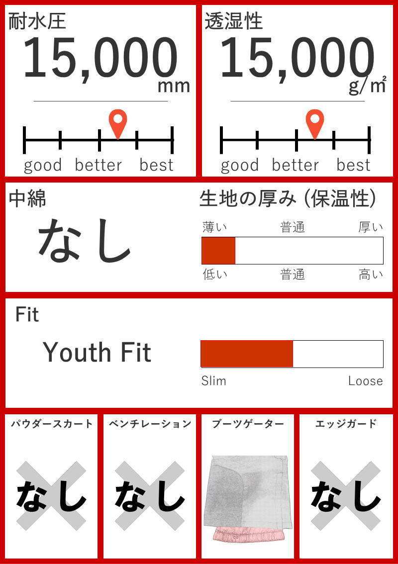 ・耐水圧:15,000mm ・透湿性:15,000g ・中綿:なし ・FIT:YOUTH FIT ・4-Wayストレッチ 2レイヤー構造の生地 ・テープ処理された縫い目 ・ロゴ入りショルダーストラップ(クリップ式脱着) ・ジッパー付きチェストポケット ・サイドジッパー ・補強されたヒップパッチ ・ステッチ補強された股上と股下 ・起毛トリコットポケット裏地 ・レースフック付きストレッチブーツゲイター ・ウェストのパウダーガード:なし ・ベンチレーション:なし ・エッジガード:なし ・ブーツゲーター:あり ・生地の厚さ:ふつう |
