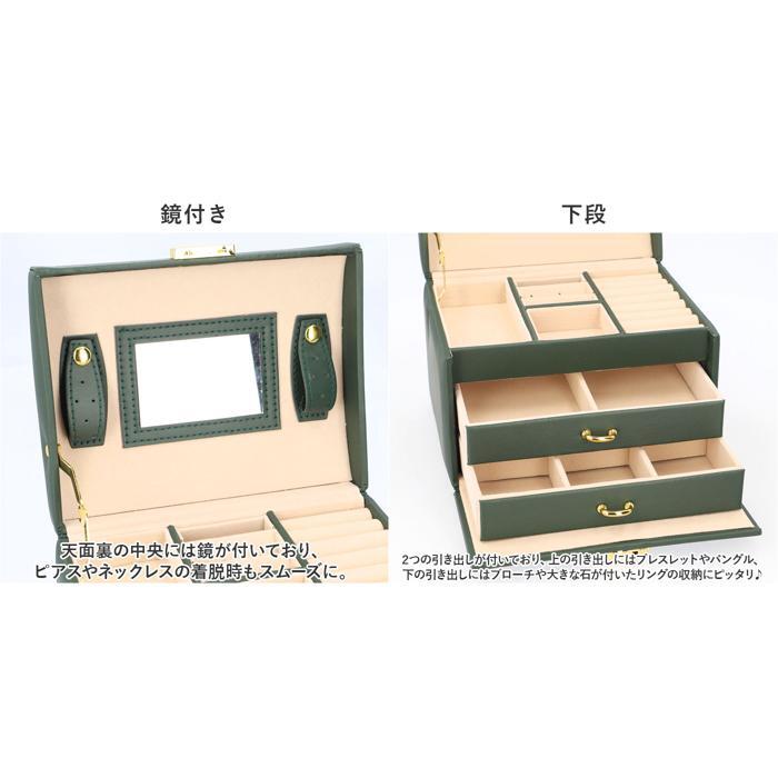 | 商品説明 | ・・お気に入りのアクセサリーをまとめて収納♪鍵付き大容量ジュエリーボックスが新登場。 ・【見やすくたっぷり収納できる3段式!】 ・なくしがちなアクセサリーをまとめて整理整頓◎上段と下段合わせて3段の収納が付いており分けて収納できるのがポイント。 ・【上段】 ・よく使うアクセサリーの収納に便利!リングスロット×8とピアス穴×16、大小1ずつのトレー付き。 ・大のトレーは縦に長く、腕時計の収納に便利◎ ・【鏡付き】 ・天面裏の中央には鏡が付いており、ピアスやネックレスの着脱時もスムーズに。 ・【下段】 ・・2つの引き出しが付いており、上の引き出しにはブレスレットやバングル、下の引き出しにはブローチや大きな石が付いたリングの収納にピッタリ♪ ・【仕切りの取り外しが可能】 ・上段のピアス穴付き仕切りと、下の引き出しの仕切りは取り外しが可能。収納するアクセサリーに合わせてカスタマイズが可能。 ・【傷付きを防止】 ・内張りと仕切りはベロア調の生地を使用し、アクセサリーを優しく保護。 ・【ワンタッチ開閉】 ・開口金具の両サイドを内側に押してオープン!戻す時は、カチッと鳴るまでフタを閉じるだけ。 ・【鍵付きで安心】 ・大切なアクセサリーを保管するのに最適◎ ・【出しっぱなしでもOK】 ・程よい光沢感とゴールドパーツが上品な仕上がり♪インテリアに溶け込み、出しっぱなしでもOK。 |