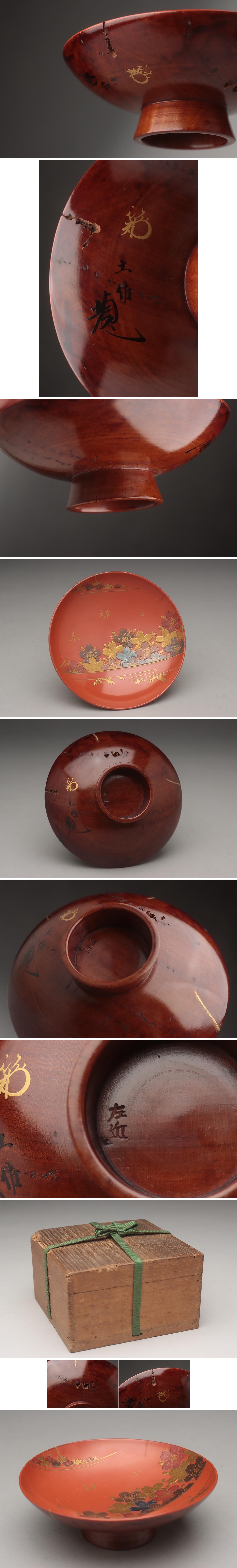 ◆ 時代漆工芸【戸澤左近 作】木地 朱漆塗 小初瀬山桜蒔絵盃 径9cm 土佐守光貞筆 共箱附・蒔絵杯 酒器 漆器 古美術 ◆