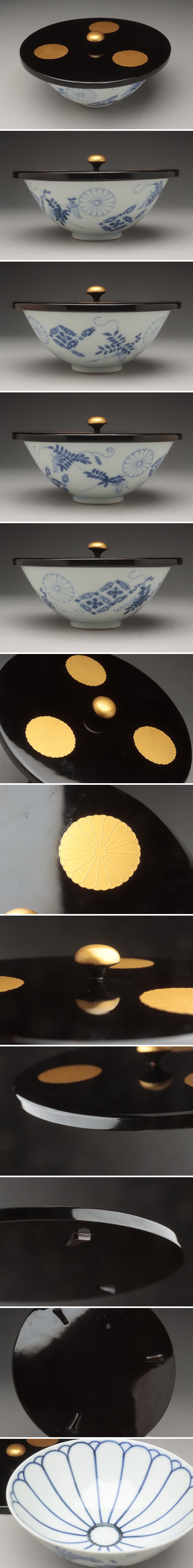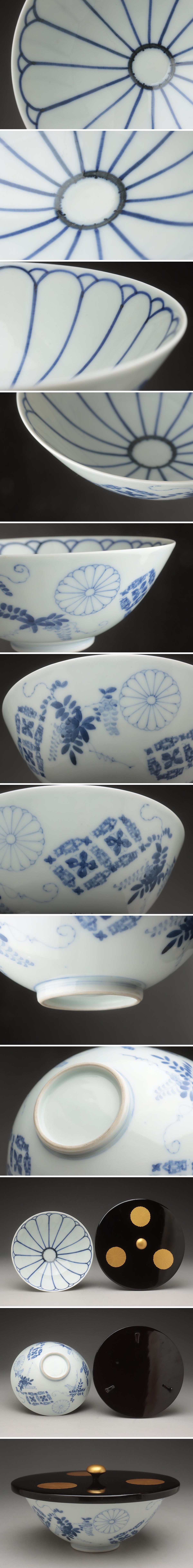 ◆ 時代 御下賜品 菊御紋章入 染付 藤菱花見込菊文 茶碗 菊紋金蒔絵蓋付・染付菊割碗・蒔絵蓋碗 古美術品 検)天皇家 ◆