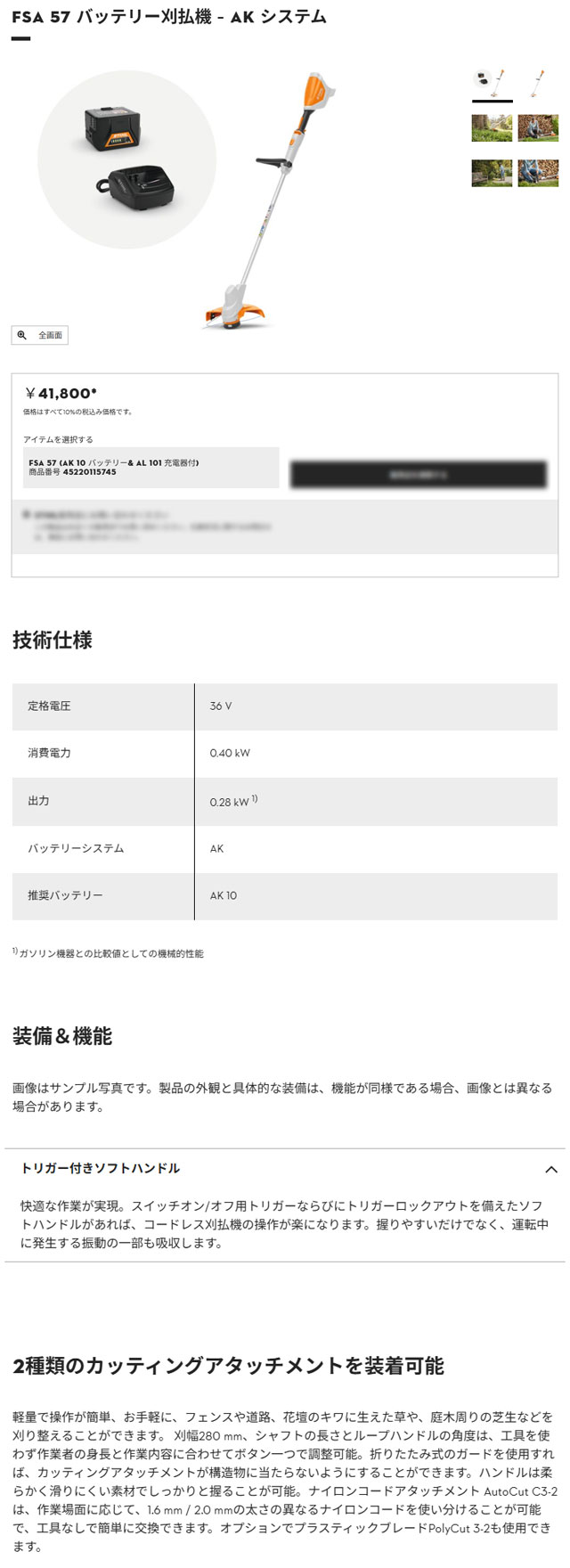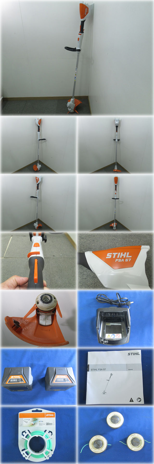 スチール 36Vバッテリー刈払機 FSA57 を出品いたします。 ■特徴■ 2種類のカッティングアタッチメントを装着可能 軽量で操作が簡単、お手軽に、 フェンスや道路、花壇のキワに生えた草や、 庭木周りの芝生などを刈り整えることができます。 刈幅280 mm、シャフトの長さとループハンドルの角度は、 工具を使わず作業者の身長と作業内容に合わせて ボタン一つで調整可能。 折りたたみ式のガードを使用すれば、 カッティングアタッチメントが 構造物に当たらないようにすることができます。 ハンドルは柔らかく滑りにくい素材で しっかりと握ることが可能。 ナイロンコードアタッチメント AutoCut C3-2は、 作業場面に応じて、 1.6 mm / 2.0 mmの太さの異なる ナイロンコードを使い分けることが可能で、 工具なしで簡単に交換できます。 プラスティックブレードPolyCut 3-2も使用できます。 トリガー付きソフトハンドル 快適な作業が実現。 スイッチオン/オフ用トリガーならびに トリガーロックアウトを備えたソフトハンドルがあれば、 コードレス刈払機の操作が楽になります。 握りやすいだけでなく、 運転中に発生する振動の一部も吸収します。 ■仕様■