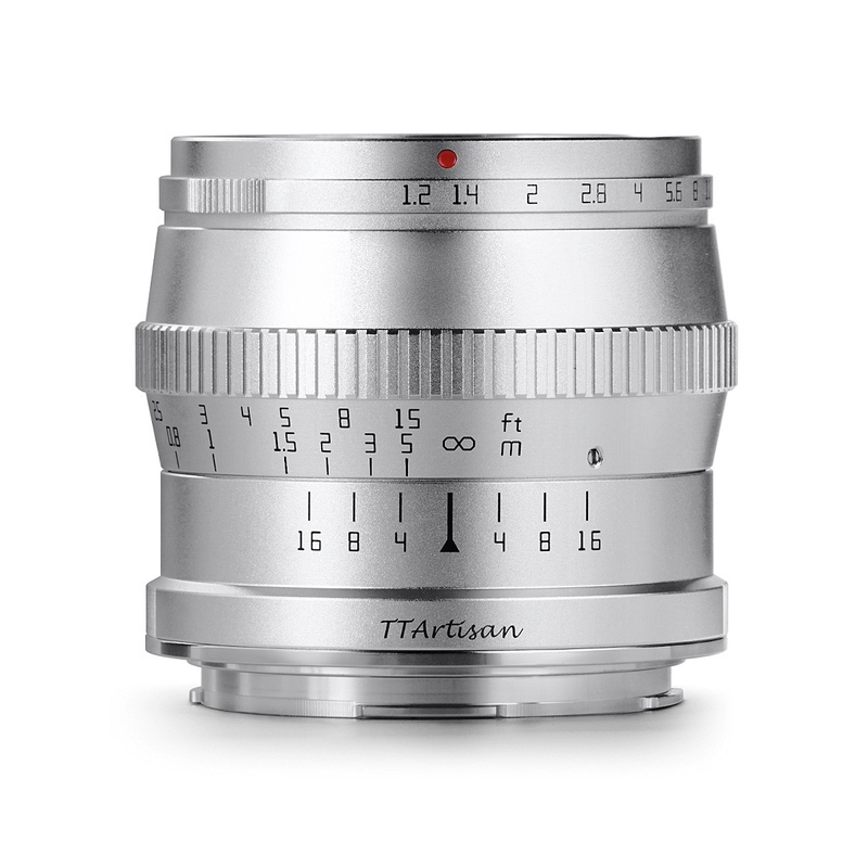 銘匠光学(めいしょうこうがく)TTArtisan 50mm f/1.2 Cは、開放F値1.2の大口径でありながらコンパクトに設計された75mm相当(APS-C)の中望遠レンズです。美しいボケ味を生かしたポートレート撮影や、夜景などの光量の足りない場面で活躍するレンズです。絞りリングの操作は心地よいクリック感があり、外装はアルミニウム合金製で上質な仕上がりとなっています。 レンズ構成(5群7枚)/MTF図 中央部の解像度と絞りによるボケの変化 仕様