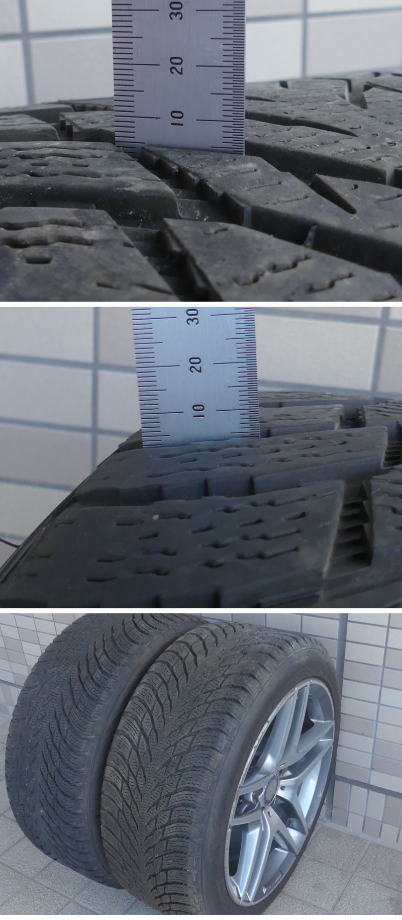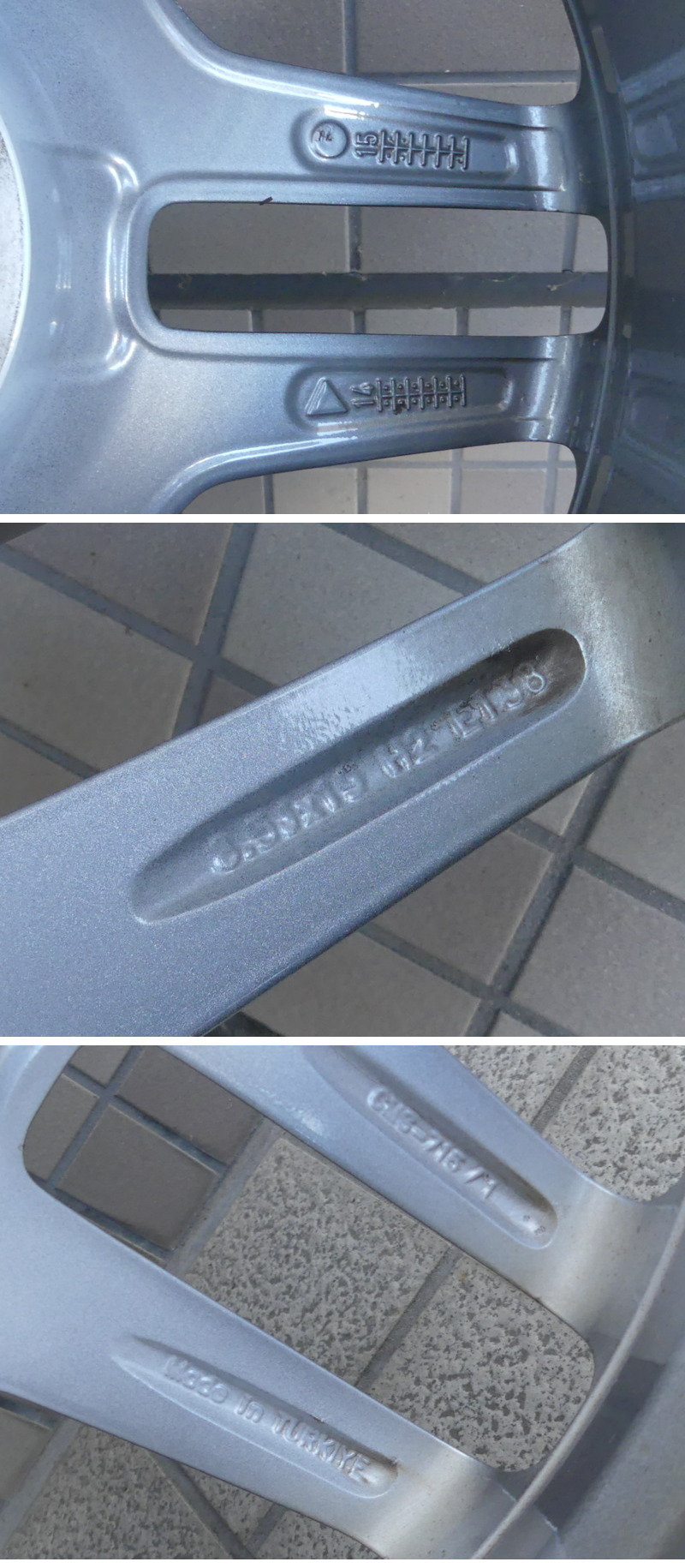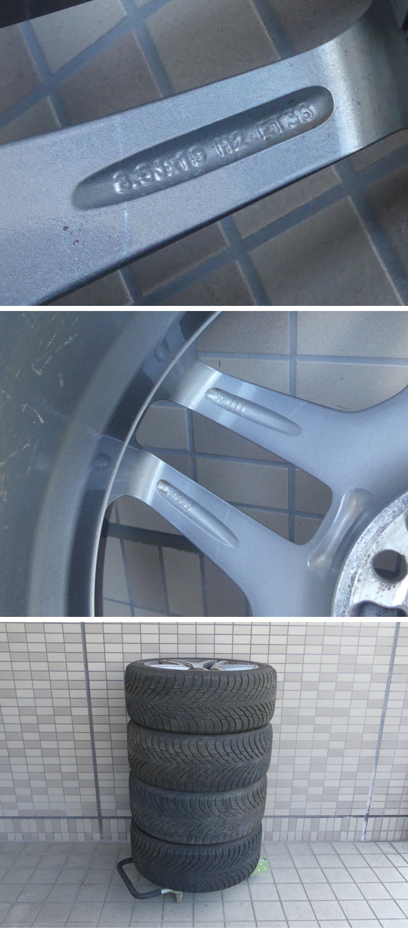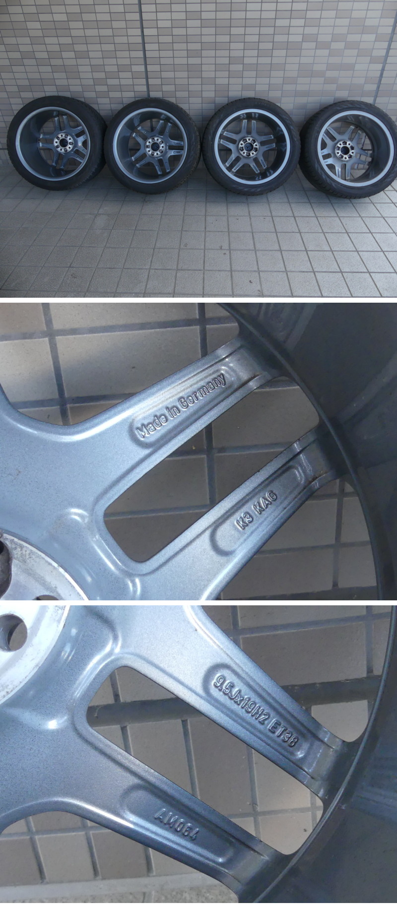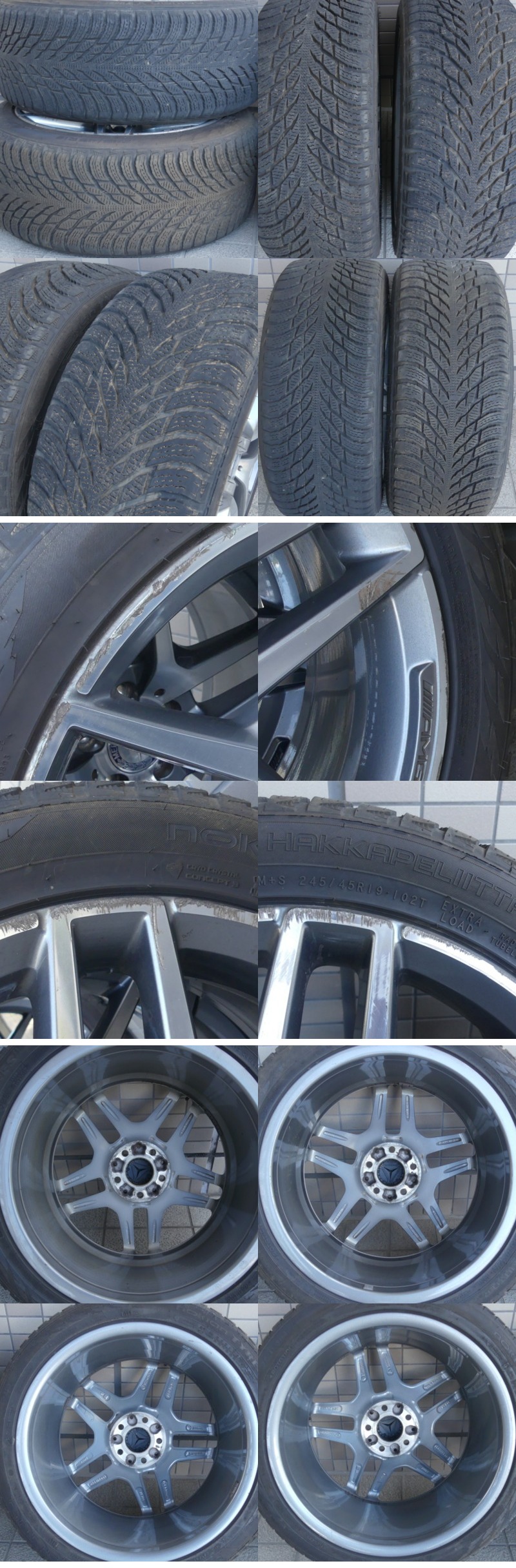 | ◇商品情報◇ | 当店の商品をご覧いただきありがとうございます!! ベンツ Sクラス W222 AMG 純正 スタッドレス付き 19X8.5J 19X9.5J +38 PCD112 5穴 A2224010000 A2224010100 (品番) ・ホイール前 :A2224010000 ・ホイール後 :A2224010100 (スタッドレス) ・タイヤ前 :Nokian Tyres Hakkapeliitta R3 245/45r19・102T ・タイヤ後 :Nokian Tyres Hakkapeliitta R3 245/45r19・102T (DOTコードは前後4本ともに2021) 専門店でないため、正確なサイズやW222以外の取付車種などは分かりませんので予めご承知下さいませ。 素人採寸となり若干の誤差はあるかと思いますがご了承くださいませ。 (ホイール) 【フロント】8.5J×19 +38 【リア】9.5J×19 +38 【PCD】112mm 【穴数】5穴 【ハブ径】66.5mm 【カラー】チタニウムグレー (タイヤ) 溝残りは画像よりご確認ください ホイールは4本ともに程度は様々ですがガリキズ、汚れなどが多々あります。 タイヤは細かな小石、汚れなどがあります。 (台車は付属しません) 種類、状態などは画像よりご確認、ご判断くださいませ。 佐川急便200サイズ2個口送料(離島、沖縄への発送は不可) 11080円:熊本 宮崎 鹿児島 10380円:福岡 佐賀 長崎 大分 9320円:徳島 高知 香川 愛媛 9320円:鳥取 島根 岡山 広島 山口 7660円:滋賀 京都 大阪 兵庫 奈良 和歌山 7440円:富山 石川 福井 7440円:岐阜 愛知 静岡 三重 6960円:新潟 長野 8960円:茨城 東京 神奈川 山梨 群馬 埼玉 千葉 栃木 9200円:宮城 山形 福島 9780円:青森 岩手 秋田 12860円:北海道 発送はホイール面を養生したうえでPPバンド、プチプチなどで結束し簡易梱包にて着払い佐川急便200サイズ2個口での発送となります。 ※目視チェックをしていますが、表記漏れや見落としや細かな擦れ・薄汚れなどがある場合もございますので予め画像をご確認の上でご入札をお願いいたします。 商品のトップ画像端に写っている茶筅はサイズ比較用の備品ですので付属はしません | |||