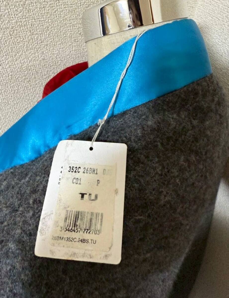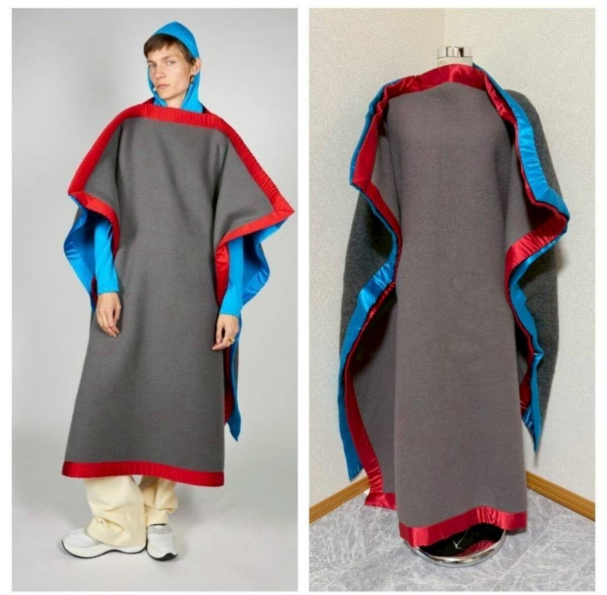 前後でグレーのお色が異なり、光沢のあるサテン地の赤と青でトリミング。