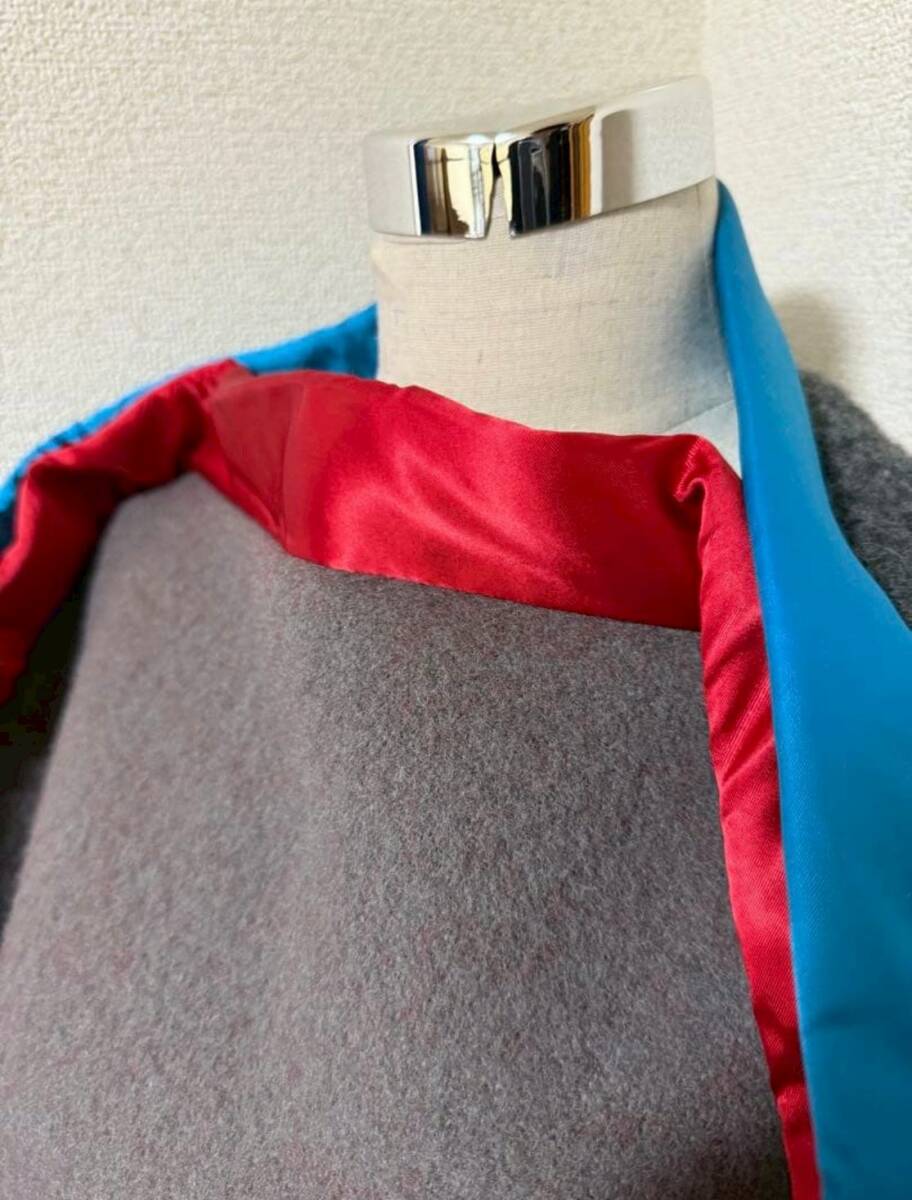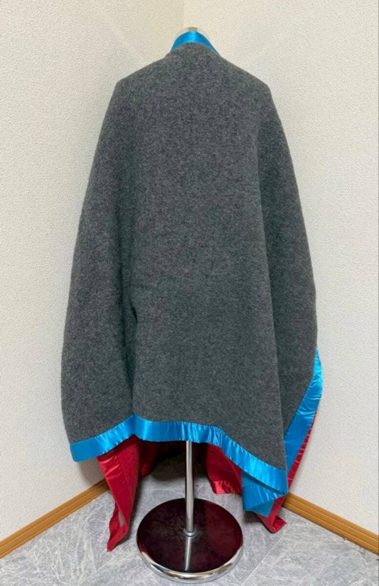 内側に赤と青のウールを使用した二重仕立てのウールブランケットコート。