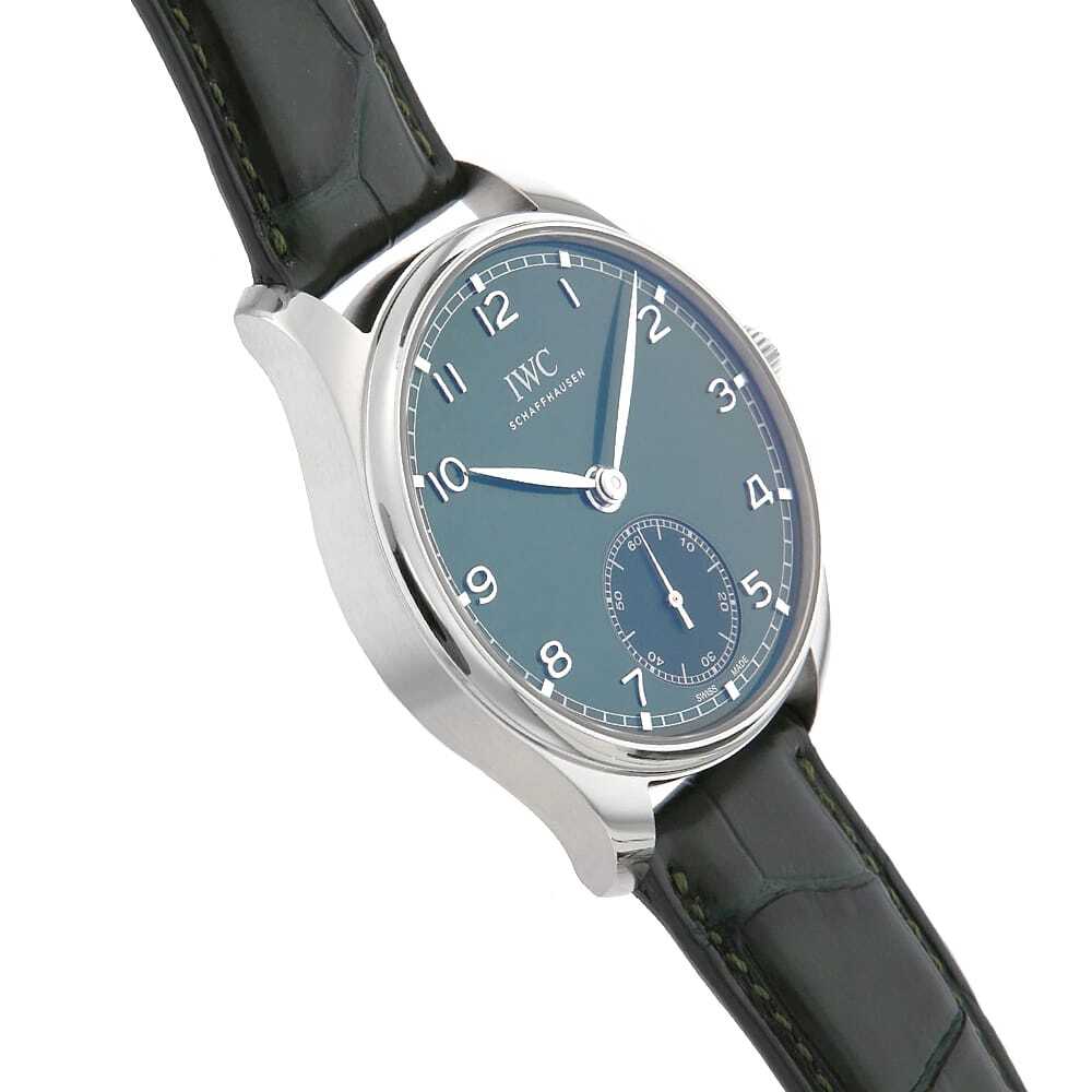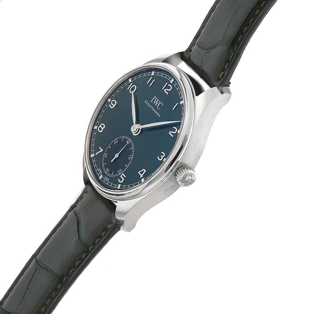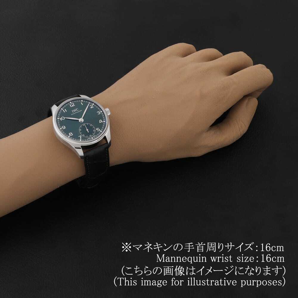 | モデル情報 | 1930年代にポルトガル商人がオーダーメイドした時計を原形として製造が開始されたポルトギーゼ。その中でも「ポルトギーゼ・オートマティック40」はポルトギーゼ」の特徴的なデザインを40mmというコンパクトなサイズで実現したモデルです。ムーブメントには自社製ペラトン式ムーブメントCal.82200を搭載しています。反時計回りにリューズを動かすとゼンマイが巻き上がる仕様です。パワーリザーブ約60時間。深みのあるグリーンダイアルとグリーンの革ベルトを組み合わせた、洗練された印象のモデルです。ポルトギーゼシリーズの特徴であるレイルウェイ式ミニッツトラックと、6時位置のスモールセコンドがクラシカルな雰囲気を醸し出しています。 |