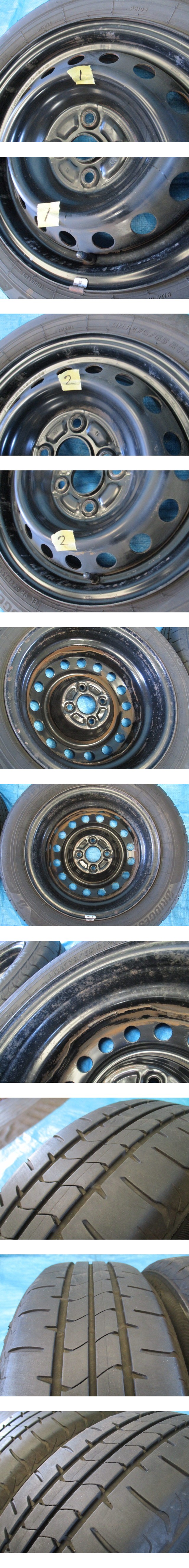 ※下記情報をよくご確認いただいたうえで入札してください。 弊社では「まとめて取引」への対応は行なっておりません。 同梱をご希望の場合はご入札前にご質問下さい。 同梱可能な商品の場合は対応いたします。 また、質問や連絡等なくまとめて購入を選択・決済をされた場合は別途追加の送料をいただくことがあります。 営業日15時までの入金確認で即日発送できます。 日曜日、第2・第4土曜日、祝祭日はお休みを頂いてます。 ■取り外し車両 ●認定型式=CBA-NCZ20(トヨタ ラウム) ●フル型式=NCZ20AHPXK ●年式=2008/03 ●車体番号=0123*** ●走行距離=138,812km ●エンジン型式=1NZ-FE(1.5L) ●ミッション型式=U340E(4AT) ●型式指定/類別区分=12101/0004 ●グレード=ラウム Gパッケージ ●駆動=2WD ■詳細 ・上記車両からの取り外しです。 ・タイヤ付ホイール2本セットの出品です。 ※1本 約14kg ●タイヤ サイズ 175/65R14 メーカー/銘柄 BRIDGESTONE(ブリヂストン) NEWNO(ニューノ) 製造年週 2023年09週 2024年35週 残溝 2本ともに約8分山 ●ホイール 20系ラウム 純正スチール(ブラック9 サイズ 14×5.5JJ ハブ径54mm 4H PCD100 ■状態 ●タイヤ 片べりやパンク修理等なく問題なくご使用いただけると思います。 ●ホイール 2本ともに、ホイールキャップ跡、裏側にサビあります。 曲がりや変形はありません。 ・気持ち良くお使い頂く為、出来る限りの掃除はしています。 ※当方で自動車部品を出品していますので、よろしければ下記のURLよりご覧ください。 team818ys出品リスト⇒https://auctions.yahoo.co.jp/seller/team818ys ■在庫管理番号 2500590-1 ■送料 (元払いのみの対応)運送会社の選択はできません。 [ 北海道 ] 5400円 (北海道) [ 東北 ] 3600円 (青森、岩手、秋田 山形、宮城、福島) [ 関東・中部 ] 3500円 (茨城、栃木、群馬、埼玉、千葉、東京、神奈川、山梨、新潟、長野、静岡、愛知、岐阜、三重、富山、石川、福井) [ 関西 ] 3000円 (滋賀、京都、大阪、兵庫、奈良、和歌山) [ 中国 四国 ] 3000円 (鳥取、岡山、島根、広島、山口 香川、徳島、愛媛、高知) [ 九州 ] 3600円 (福岡、佐賀、長崎、熊本、大分、熊本、宮崎、鹿児島) 沖縄県・離島の方は送料をお問合せ下さい。 最後までご覧頂き有難うございました。ご検討宜しくお願い致します。 | ||||