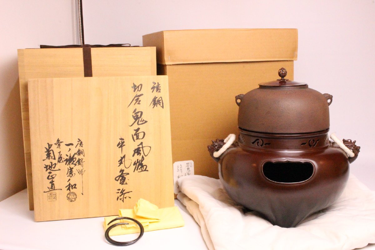 菊池正直 釜 一ノ瀬宗和 風炉 唐銅 切合鬼面風炉「共箱・共布・保護箱・釜鐶・布団」| 出价者 | 信用 | 价格 | 时间 |