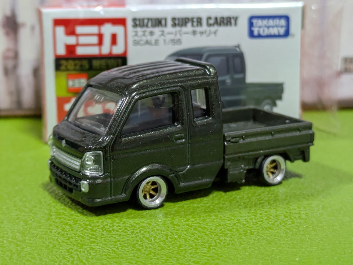 ★トミカ スズキ スーパーキャリイ改深リム、ローダウン他にも色々出品中! (検索用、トミカ、京商、グラチャン、深リム、ローダウン、トミカリミテッド、トミカプレミアム)現状渡し、タイヤは回転しません。未使用品のモデルを使用していますが改造の際、シャーシ、ボディ内側、等を削っていますのでジャンク扱いでお願いいたします。量産品のモデルを使用していますので、塗装ムラや浮き、デカールのズレ、キズ等がある場合があります、素人の趣味の範囲の作製ですので仕上げが荒い部分も有るかと思いますので神経質な方は入札をご遠慮下さい。迅速なお取引を心がけますが、当方、仕事の都合上、連絡が遅くなる場合があります。他にも出品していますのでよろしくお願いいたします。