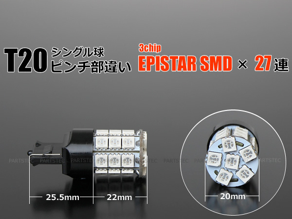 | 仕様 | ■DC: 12V/24V車専用 ■前面 : 3chip 5050smd×5連 ■側面 : 3chip 5050smd×22連 ■カラー : アンバー(黄色) ■ソケット部 : T20 ピンチ部違いシングル ■無極性 |