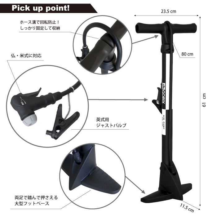 | 自転車全般で使用できる3種類バルブ対応。持ち運びやすい軽量型ポンプ。 フレームが太く1回のポンピングで一気に空気を注入できます。 自転車全般、ロードバイク、マウンテンバイク、クロスバイク、ミニベロにオススメ。 サイズ:高さ61 横幅22.3 厚み11.3 ホース80 cm 重量:670g 最大空気圧:160psi バルブ:仏式(フレンチ)、米式、英式 素材:プラスチック 付属:ジャストバルブ(英用) ・本製品は単純構造につき説明書が付属しません。 商品画像で使用方法がわからないお客様はご遠慮下さい。 | |