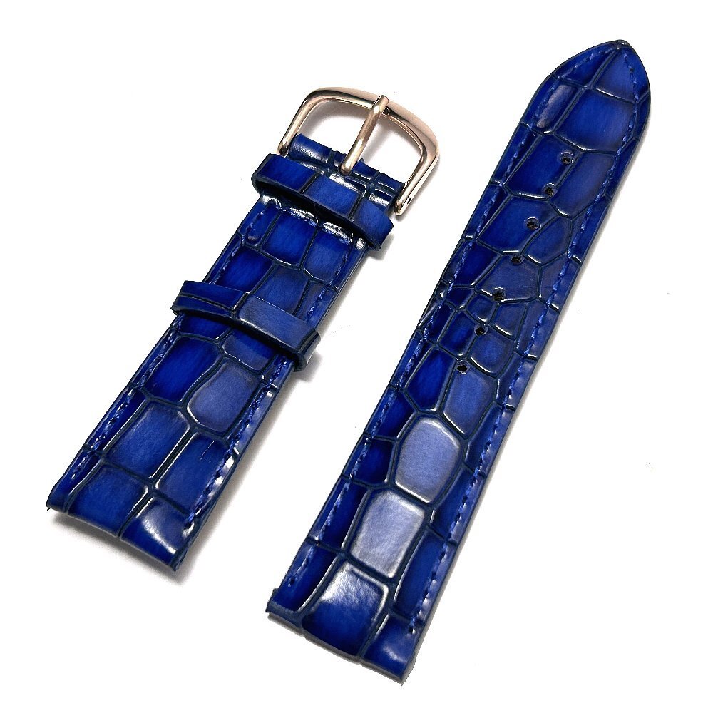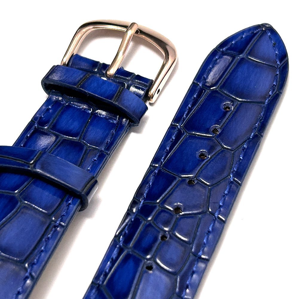 パティーヌ調の本革型押しクロコレザーの時計用ベルトになります。 カラーはベルトがブルーで、バックルはローズゴールドです。美しい陰影の付いたヴィンテージ加工が、素晴らしくラグジュアリーなベルト。根元には厚みがあり縫製もしっかりとしており、リアルクロコダイル以上の存在感とクオリティを感じさせる非常に華やかな一品です。従来の型押しレザーとは一線を駕すレベルです。 さらにはこちらオリジナルでアップルウォッチ用のコネクターをお付けしますので、通常時計とアップルウォッチの2種類を楽しんでいただけます。当方からしか購入出来ないオリジナルの物ですので、ワンランク上のベルトをコスパ良くつけたい方に是非お勧めです。 【こちらの色違い商品も出品しておりますので、よろしければご覧下さいませ。】 |