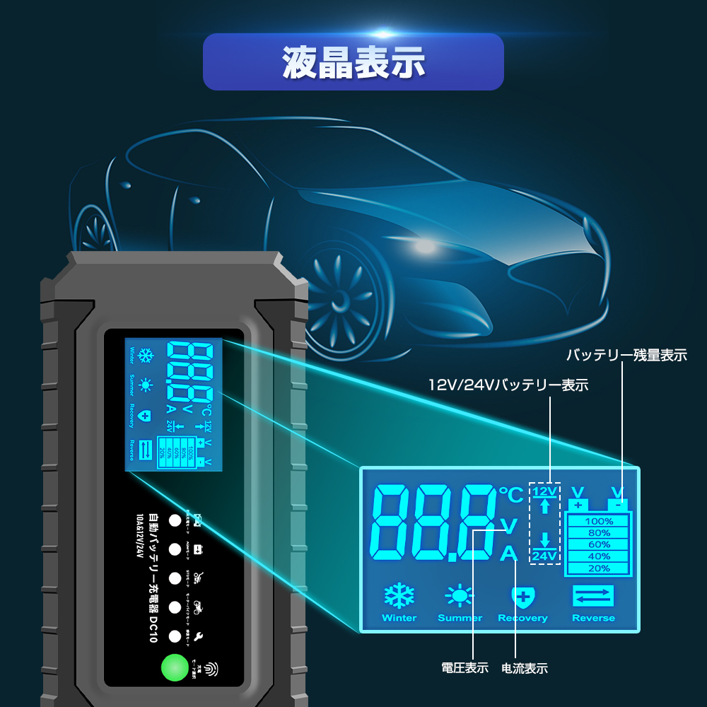 ●充電機能:全自動充電・バッテリー診断 ・急速充電・満充電後自動に停止機能 ・3段式充電(恒流充電 恒充電 浮動充電)