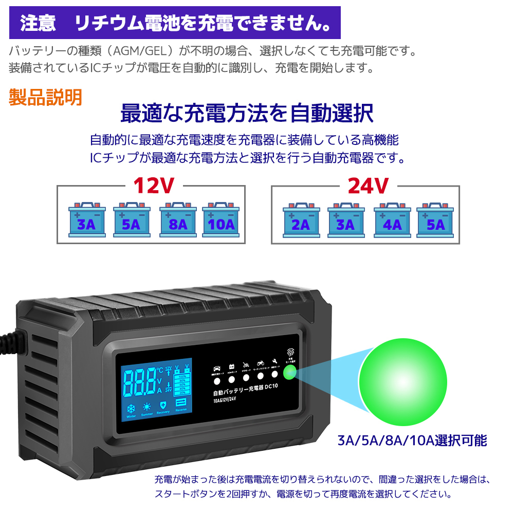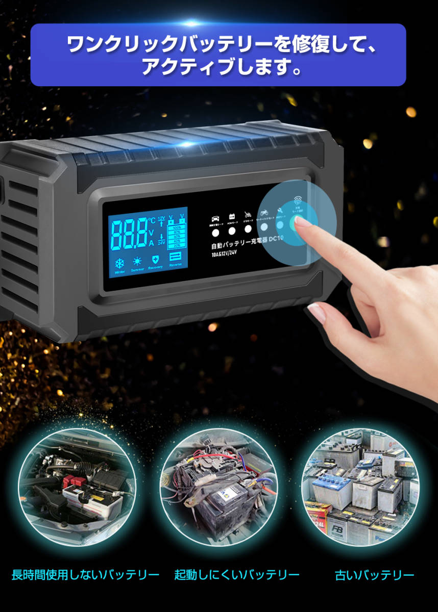 ● バッテリーのタイプや状況を自動的に診断し、バッテリー容量・状態に応じた充電を行う