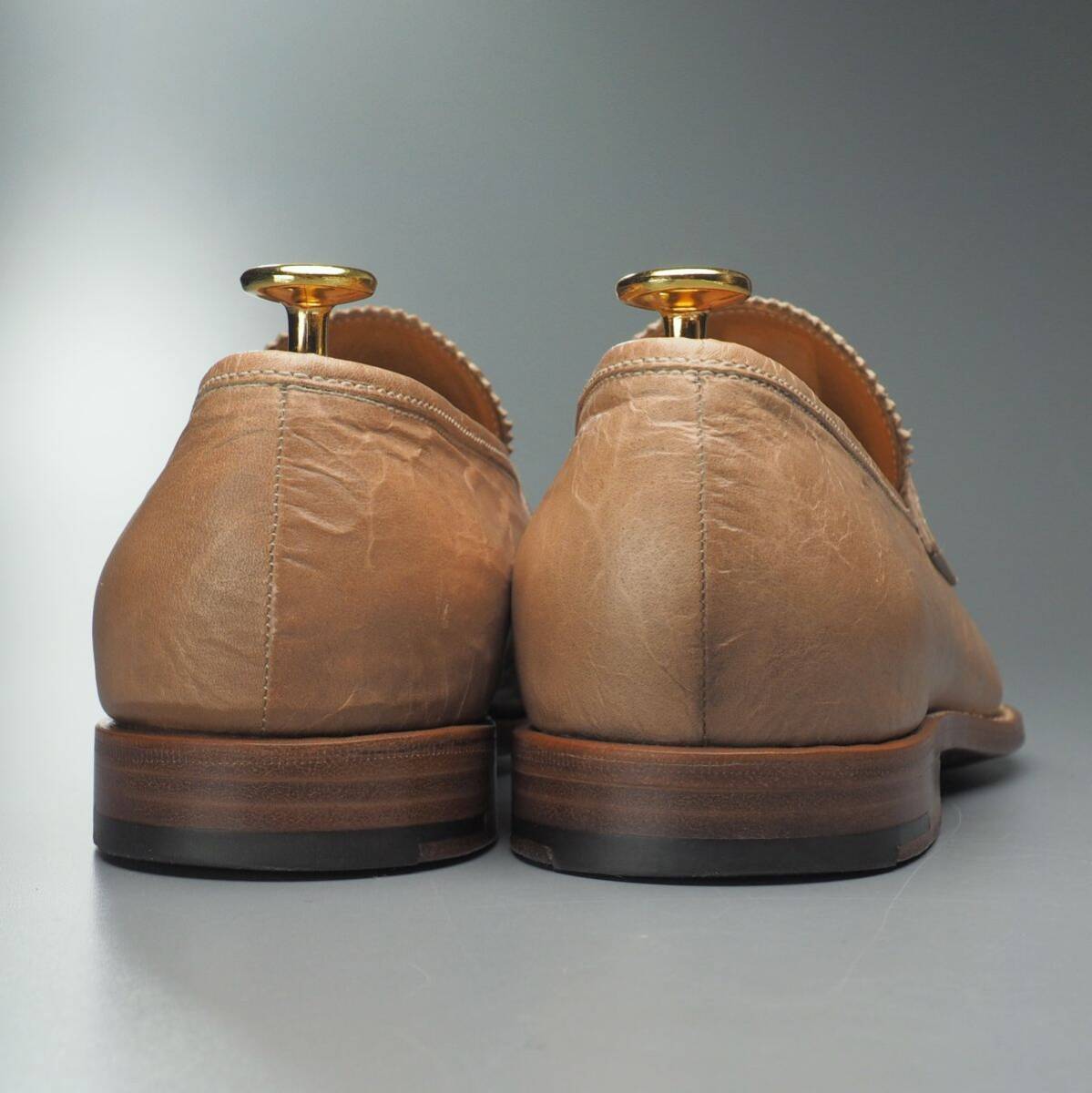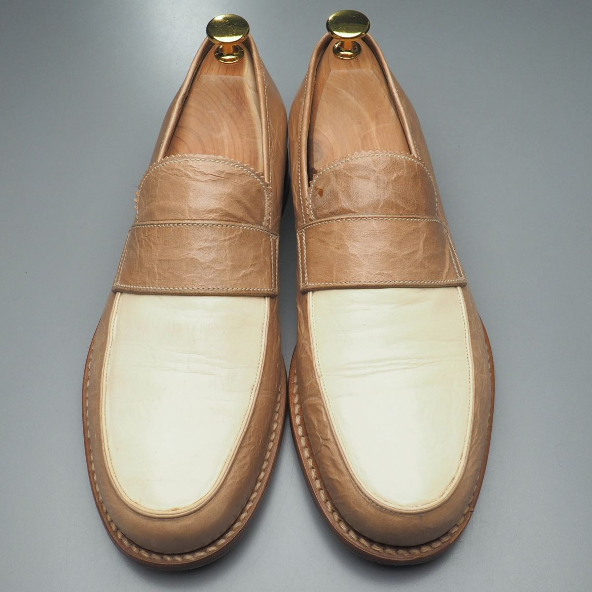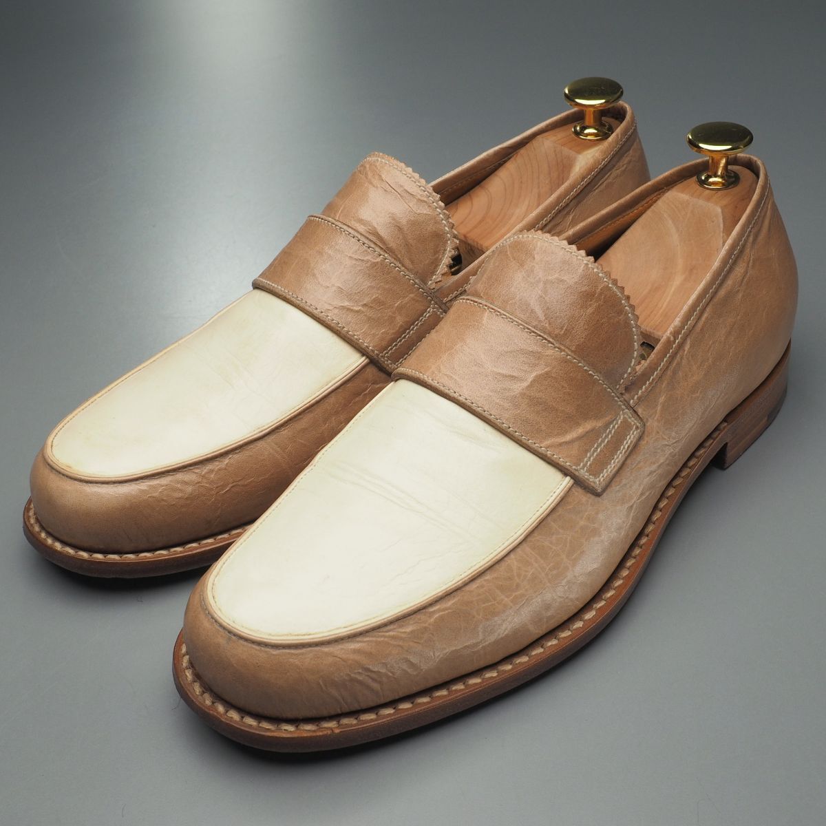 稀代のシューズデザイナーとして知られるシルヴァノ・ラッタンジ氏によって設立された高級靴ブランド「ジンターラ/ZINTALA」の一足です。 ハリがあり、独特のシワ感を表面に持つややトーンの明るい2色のレザーを使用したサドルローファー。 底付けにはグッドイヤーウェルテッド製法を採用し、堅牢に形作られております。 製法:グッドイヤーウェルテッド アウトソール:レザー(ヒドゥンチャネル) トップリフト:レザー×ラバー ライニング:レザー ※撮影用のシューキーパーは付属致しません。 ※本物の商品ですのでご安心の上オークションをお楽しみ下さい。 ※タイトル頭の英数字は弊社の管理番号です。 ※ほかにも多数の商品を出品しています。 ※同梱に関しましては「まとめて取引」でのみ対応可能です、その他の方法での同梱対応は出来かねます。 (※商品の特性上、同梱対応出来ない商品もございますので予めご了承下さい。) |