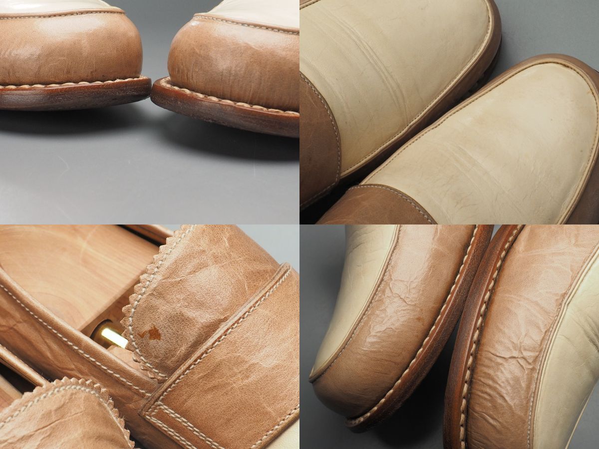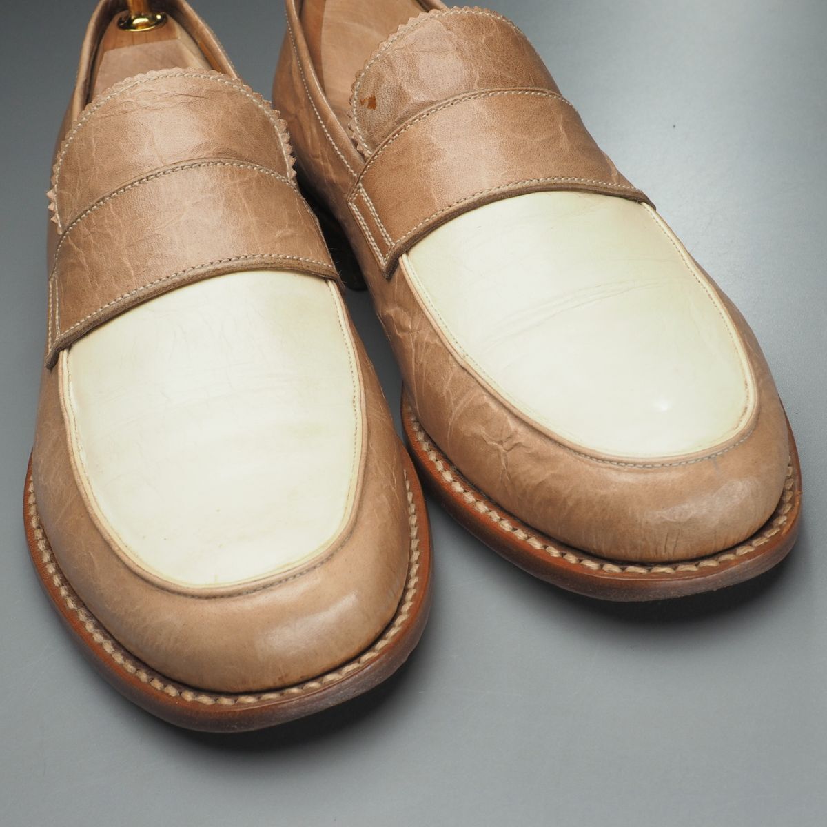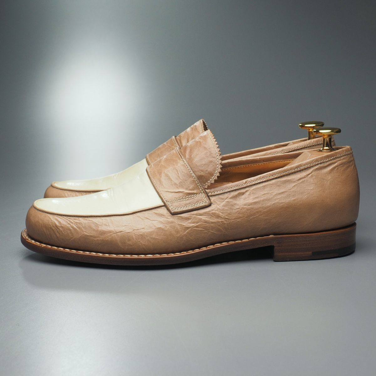 稀代のシューズデザイナーとして知られるシルヴァノ・ラッタンジ氏によって設立された高級靴ブランド「ジンターラ/ZINTALA」の一足です。 ハリがあり、独特のシワ感を表面に持つややトーンの明るい2色のレザーを使用したサドルローファー。 底付けにはグッドイヤーウェルテッド製法を採用し、堅牢に形作られております。 製法:グッドイヤーウェルテッド アウトソール:レザー(ヒドゥンチャネル) トップリフト:レザー×ラバー ライニング:レザー ※撮影用のシューキーパーは付属致しません。 ※本物の商品ですのでご安心の上オークションをお楽しみ下さい。 ※タイトル頭の英数字は弊社の管理番号です。 ※ほかにも多数の商品を出品しています。 ※同梱に関しましては「まとめて取引」でのみ対応可能です、その他の方法での同梱対応は出来かねます。 (※商品の特性上、同梱対応出来ない商品もございますので予めご了承下さい。) |