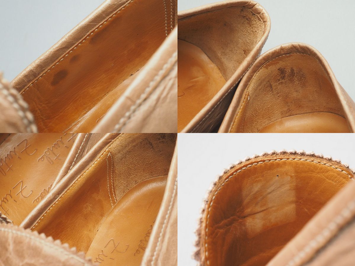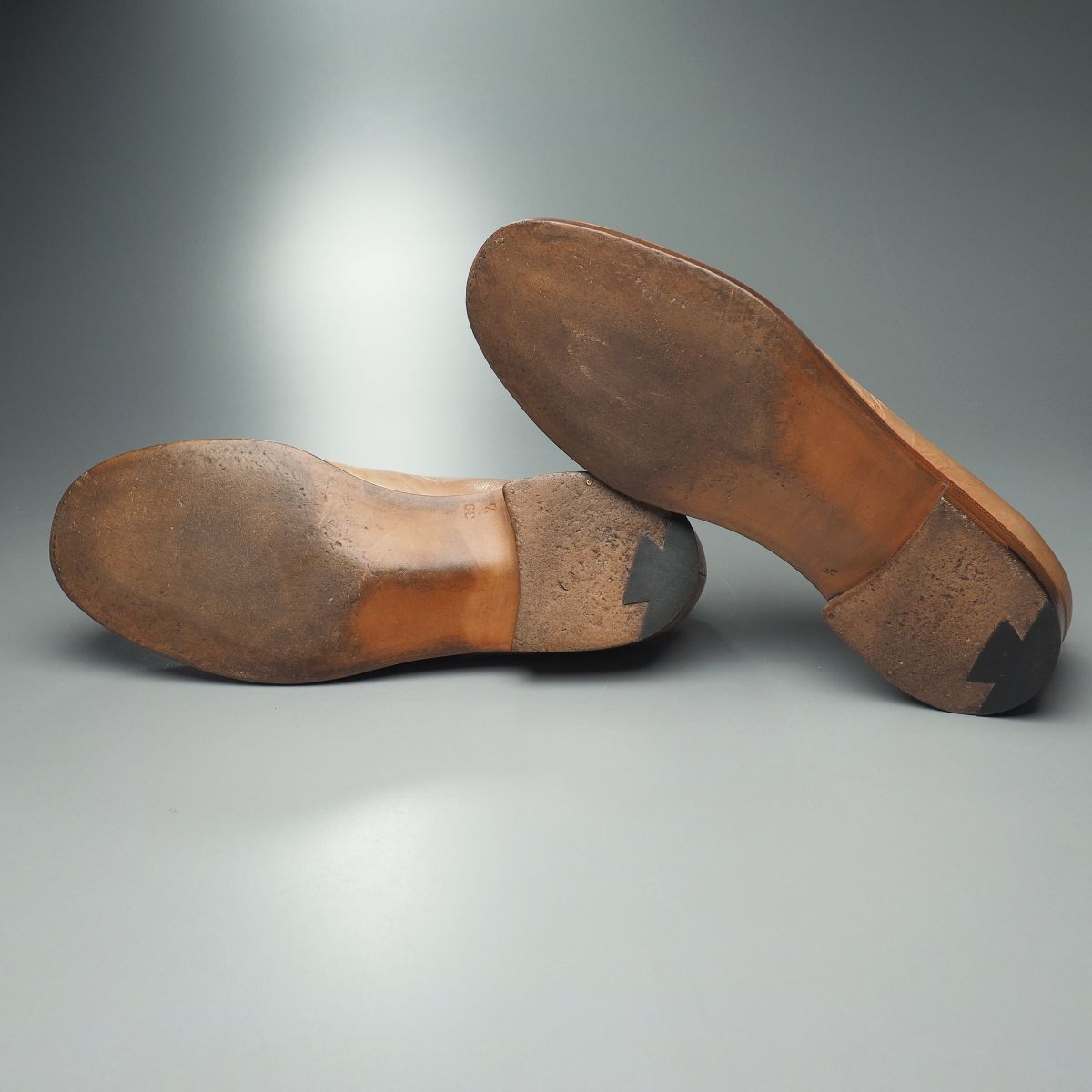 【コンディション詳細】 アッパーのシワ、薄い擦れや薄い汚れ、色ムラ、左足のベロ部分に一部汚れ、左足のかかとの際部分にシミ、インソールやライニングの薄い擦れや汚れ、シミなど見られますが、その他気になるようなダメージ等なくこれからも気持ちよくご愛用いただけます。 アウトソールの減りはトゥで3mm程度、ヒールで1mm程度です。 |