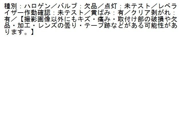 | 商品情報 | 種別:ハロゲン/バルブ:欠品/点灯:未テスト/レベライザー作動確認:未テスト/黄ばみ:有/クリア剥がれ:有/【撮影画像以外にもキズ・痛み・取付け部の破損や欠品・加工・レンズの曇り・テープ跡などがある可能性があります。】 | ||
