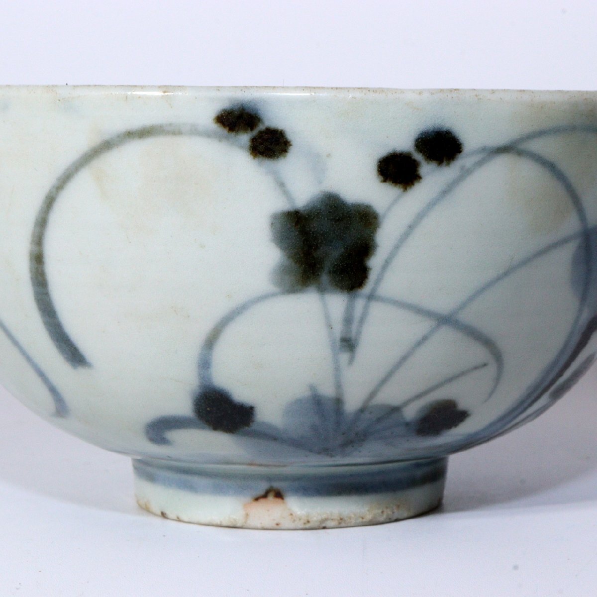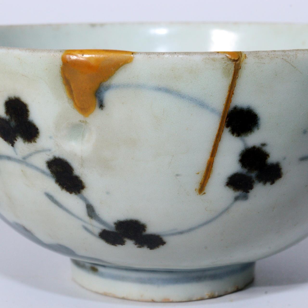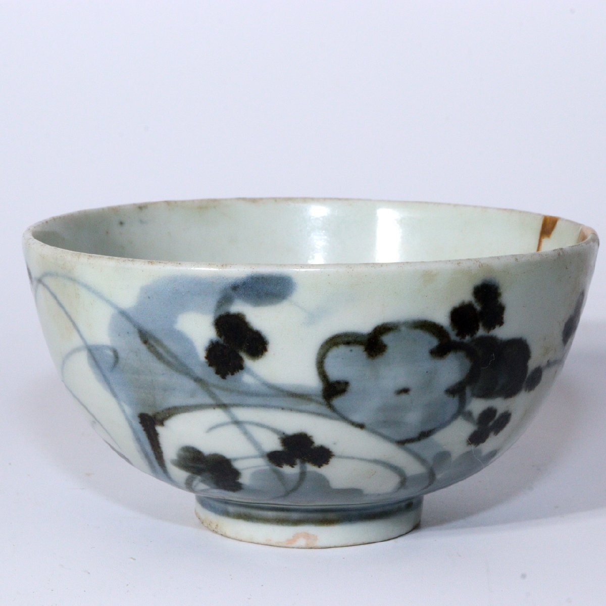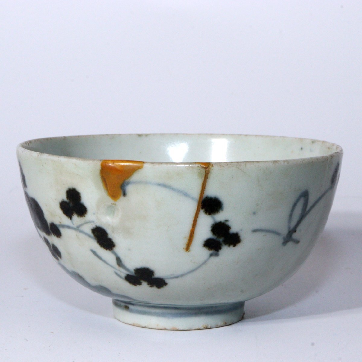 こちらは江戸期の波佐見焼の茶碗(鉢)で、 手描きによる梅文(梅の花文様)が描かれた優美な作品です。 のびやかな筆致と軽やかな余白の取り方が特徴的です。 高台裏には「大明年製」の銘が入り。 【サイズ】 高さ:約5.5cm 直径:約10.5cm 重量:約165g 【状態】 縁に修復が施されています。 全体的には良好で、時代の風合いと修復による美的趣が感じられます。 詳細は写真をご確認ください。 江戸磁器の美と手仕事の味わいを伝える佳品です。 ![]() ![]() ![]() ![]() ![]() ![]() |