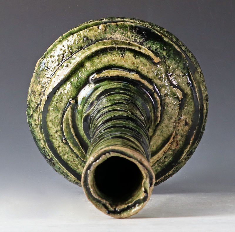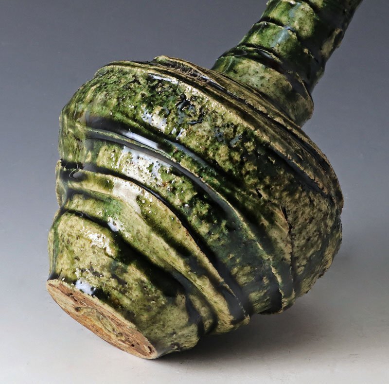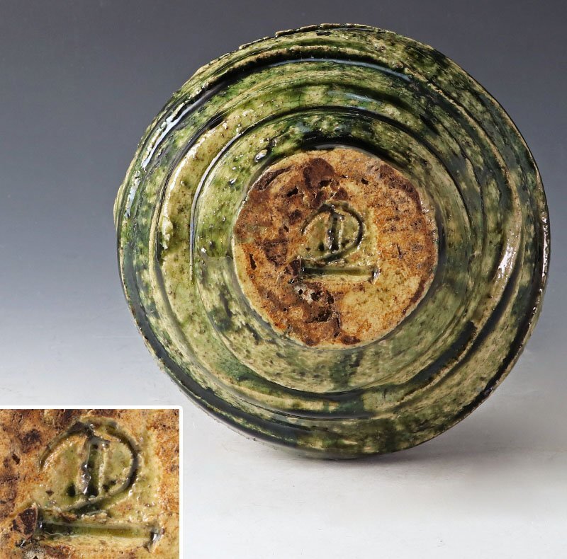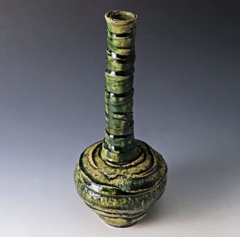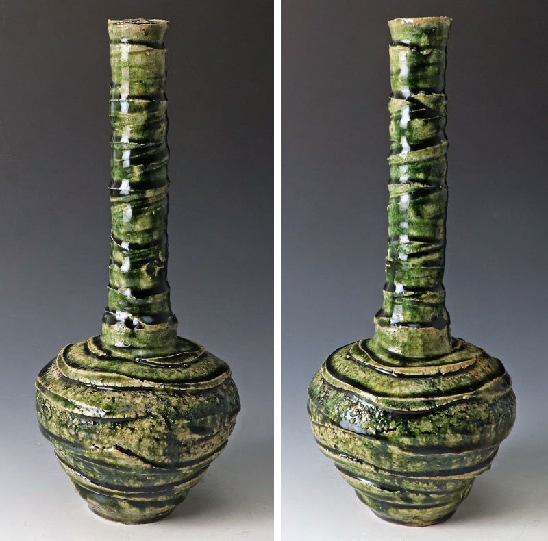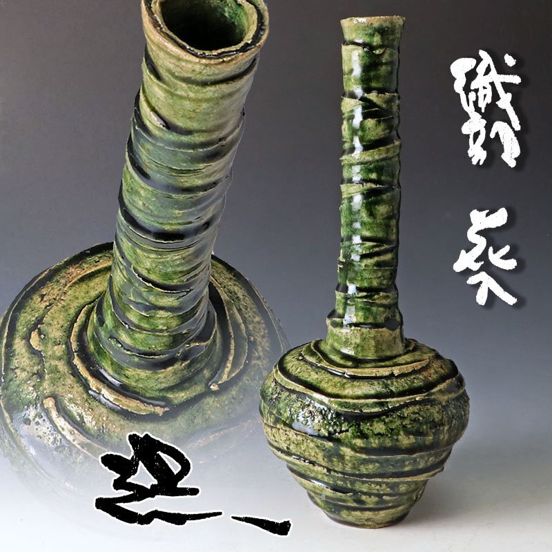 卓越した技術を持ち,斬新な作品を発表し続ける愛知の陶芸家・鈴木五郎の花入です。織部釉を用いて作られた細首の花入で,岩肌を思わせる質感の肌に,織部の緑釉が見事に調和している,作家らしい一点です。 ★商品は鈴木五郎の作品である事を保証致します。 |