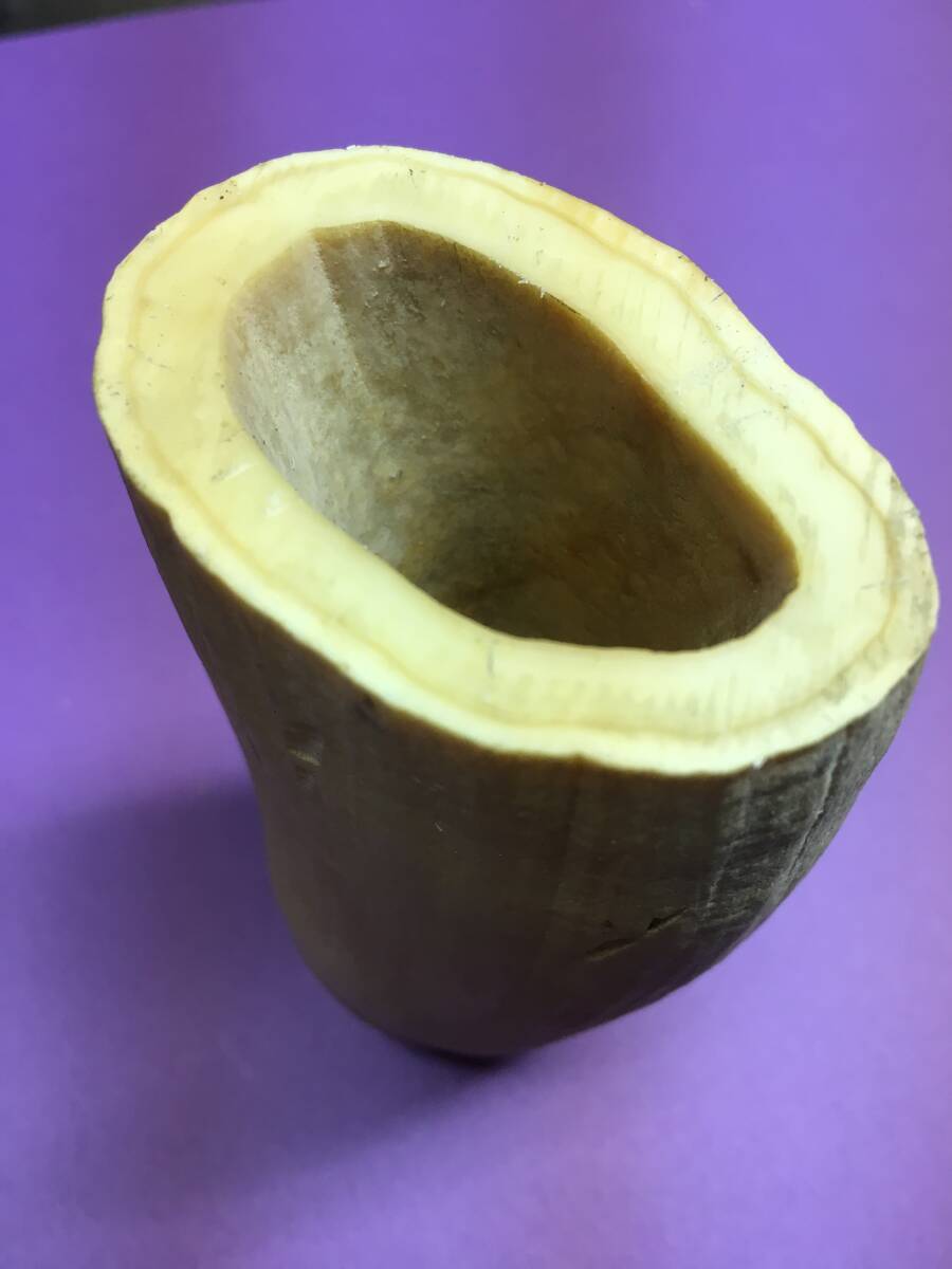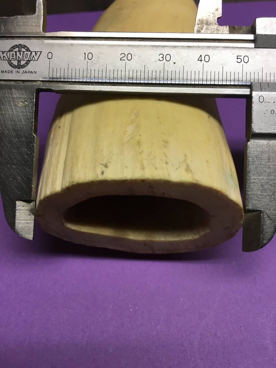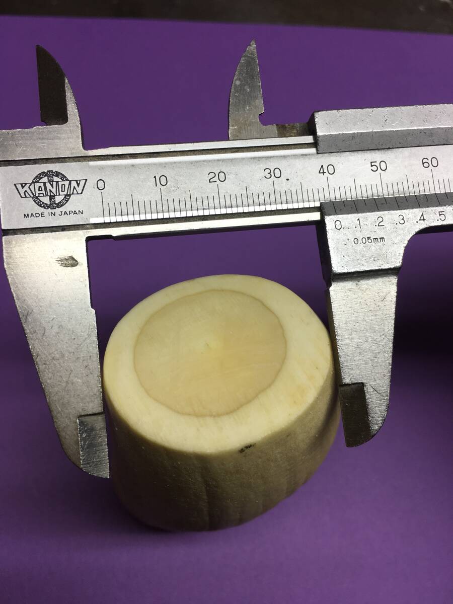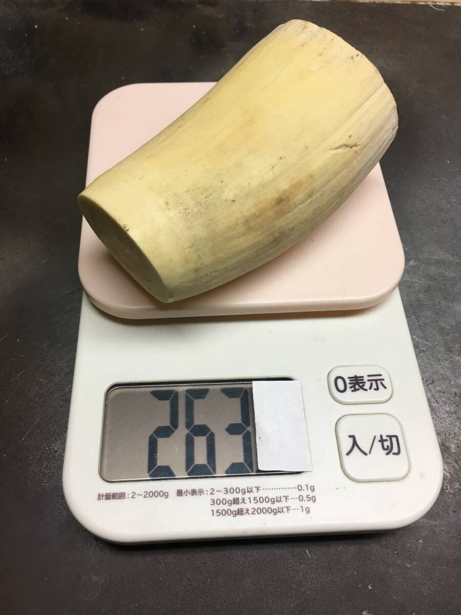 マッコウ鯨の歯のカット材、263グラムです。先がカットされています。根付、彫刻などの加工用にお使いください。表面はキズ、汚れありますが内部は良好です。