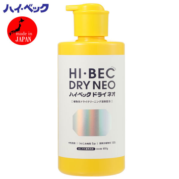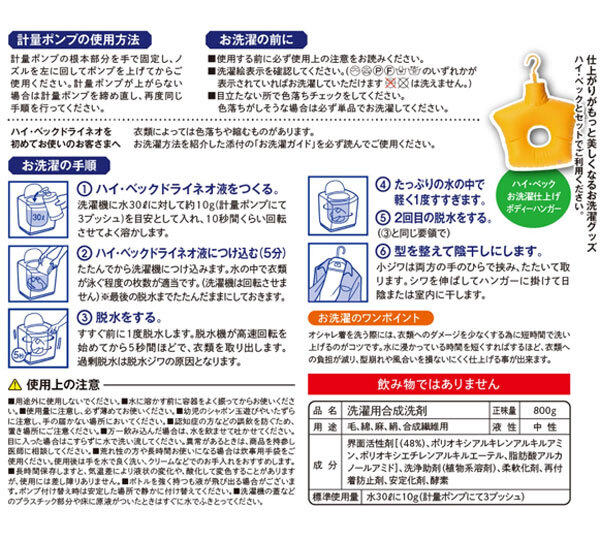 | 内 容 | ■ドライマーク表示の衣類も家庭で簡単クリーニング! ハイ・ベック ドライネオ 新プッシュボトル ■内容量 800g ■日本製 ◆参考価格 6160円相当 ドライクリーニング溶剤、界面活性剤、酵素を配合し、 ご家庭で手軽にドライマーク表示の衣類を洗える洗剤 「ハイ・ベック ドライネオ」。 本品は水を使うので油性・水溶性・ 不溶性の3つの汚れに対して同時にアタックしきれいに洗浄し、 水にも油にも溶けない不溶性の汚れ (血液・牛乳・たまご・母乳・肉汁など)まで落とすことができます。 使い方は“洗い脱水すすぎ脱水”の4ステップ。 “洗い”は水30リットルに本品約10gを溶かし、 衣類を5分間つけこむだけ。 “すすぎ”は新しい水で1回でもOKなので、 短時間でのお洗濯が可能です。 短時間のため、衣類のきしみやダメージも少なくなり、 汚れを落としながらも衣類の風合いを長持ちさせることができます。 ポンプを3プッシュで約10gなので、計量もラクラク。 ドライ溶剤は100%植物系溶剤を使用しています。 メーカー従来品よりプッシュ部分面積が大きくなり、 使いやすく、液だれがしにくいポンプを採用しました。 ※お洗濯ガイドは付属していません |