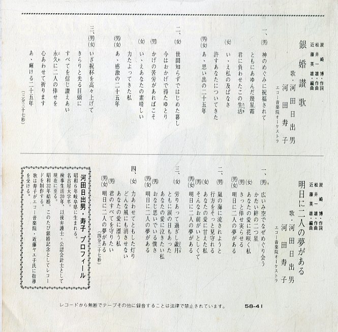 C00146758/EP/河田日出男/河田寿子「銀婚讃歌/明日に二人の夢がある」