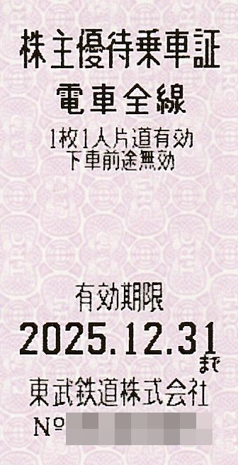 | ●東武鉄道の株主優待乗車証です。 ●有効期限 2025年12月31日までになります。 ●1枚1人片道有効です。 ●下車前途無効と記載があります。 ●入札価格は乗車証1枚の価格です。 ●お支払金額は、落札価格+送料になります。 ●詳しくは東武グループホームページをご覧ください。 | ||