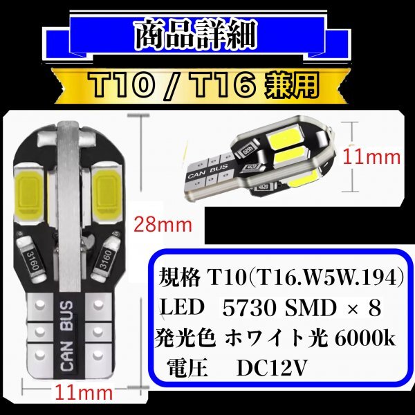 | バルブ規格:T10/T16(兼用) 光源LED:5730 SMD チップ チップ数:8連(2灯×4面) 照射角度:360° 色温度:6000K(ホワイト光) 起動電圧:DC12V 消費電力:2W LED寿命:約60000時間 防水等級:IP65 動作温度:-40℃~+80℃ サイズ:28mm x 11mm 商品内容:LEDバルブ 100個 | ||
