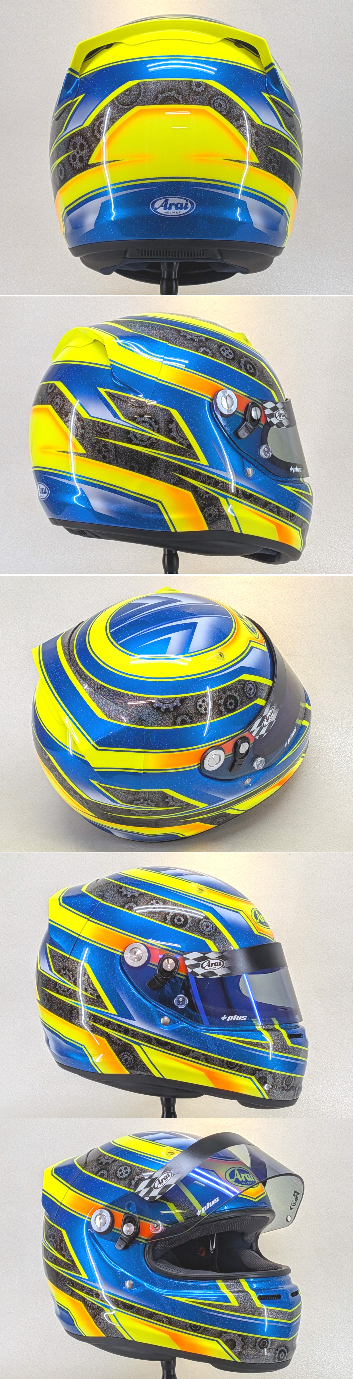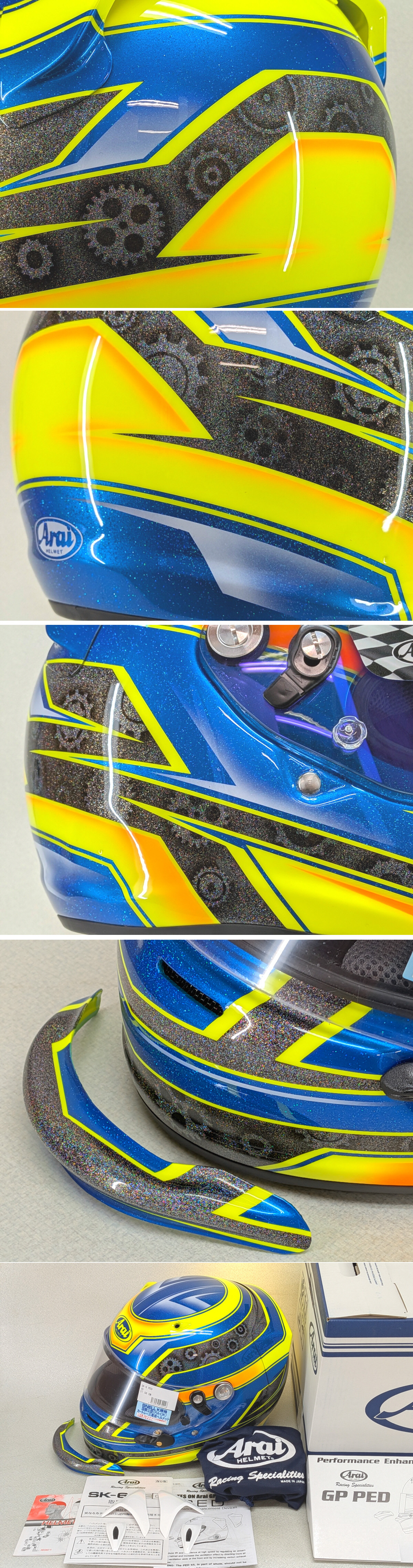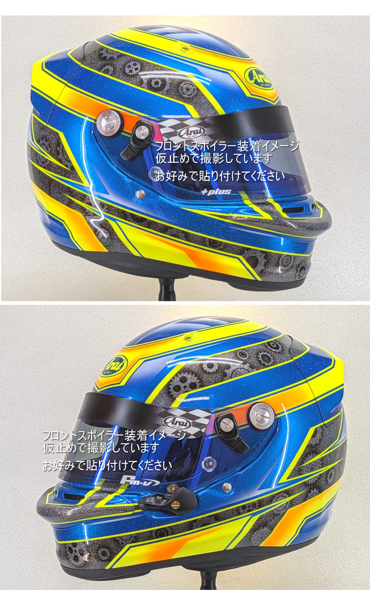 2025年8月製造 アライSK-6 PED 57-58cm(Mサイズ)新品ベースのカスタムペイント完成品です。 レーシングカート専用品ですが、サーキット走行会などでも人気です。HANSクリップは非対応です。 専門職によるワンオフのカラーリングです。同じデザインのヘルメットは他にありません。 エッジを効かせたシャープなデザイン。メタルフレークに重ねたキャンディカラーが多彩にキラめきます。 キャンディフレークブルー、蛍光イエロー、蛍光オレンジ、レーザースモークメタリックなど。 最終コートは光沢・耐久性ともに最高級のポリウレタンクリアーによる仕上がりです。 エアダクトはGP-6ティアダクトを付けてあります。 フチゴム類はすべて外した状態でペイントしますので、不自然なマスキング痕や塗料のはみ出しなどはありません。 ミラーシールドは装着イメージ用サンプルですので付属しません。標準のクリアーシールドになります。 フロントスポイラーはお好みで貼り付けてください。裏に両面テープが付いています。 新品ですので、箱・付属品等すべて揃っています。外したエアダクトパーツも同梱します。 ご覧頂いている環境によっては色合いが違って見える場合があります。 後々のキズ補修など、アフターサービスには対応しておりませんので、ご了承願います。 |