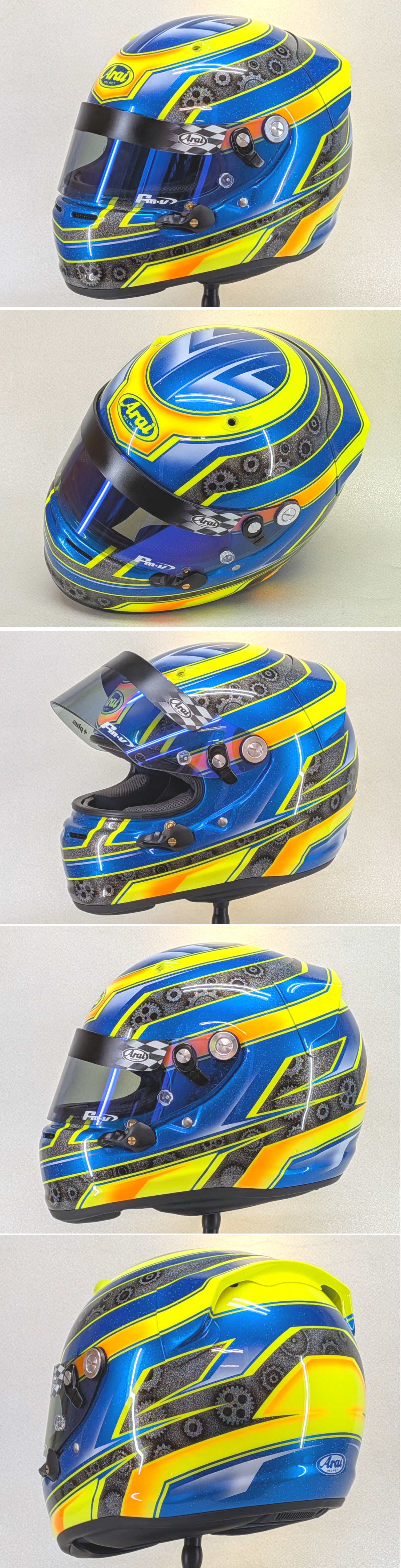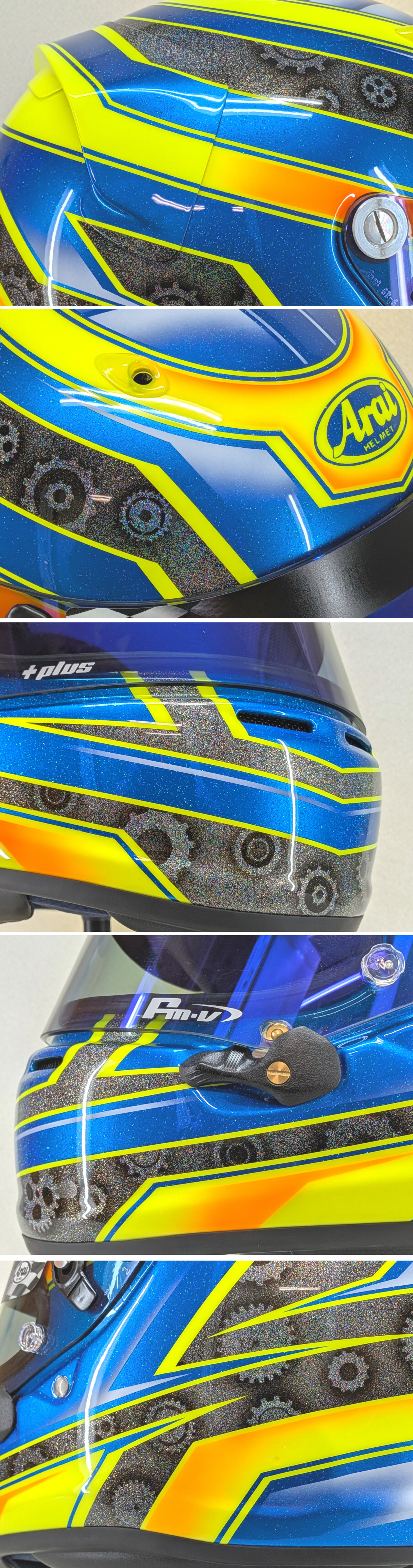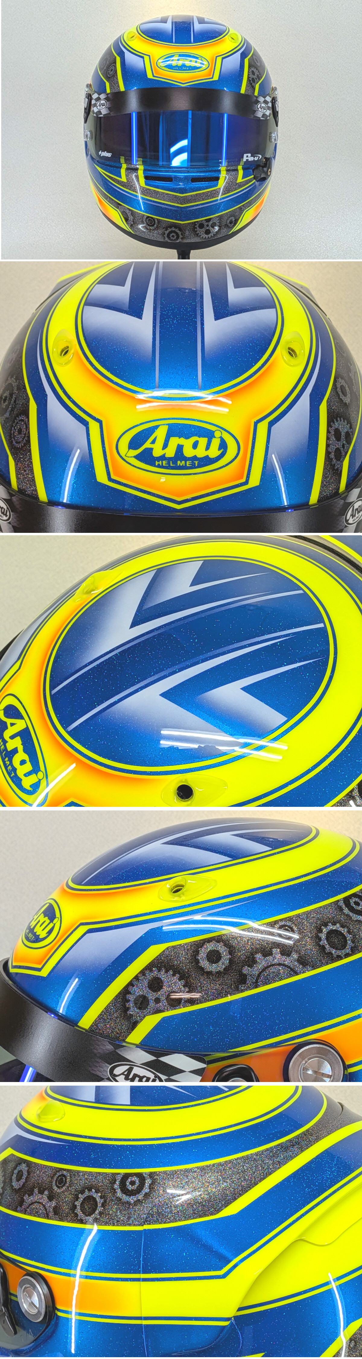 2025年8月製造 アライSK-6 PED 57-58cm(Mサイズ)新品ベースのカスタムペイント完成品です。 レーシングカート専用品ですが、サーキット走行会などでも人気です。HANSクリップは非対応です。 専門職によるワンオフのカラーリングです。同じデザインのヘルメットは他にありません。 エッジを効かせたシャープなデザイン。メタルフレークに重ねたキャンディカラーが多彩にキラめきます。 キャンディフレークブルー、蛍光イエロー、蛍光オレンジ、レーザースモークメタリックなど。 最終コートは光沢・耐久性ともに最高級のポリウレタンクリアーによる仕上がりです。 エアダクトはGP-6ティアダクトを付けてあります。 フチゴム類はすべて外した状態でペイントしますので、不自然なマスキング痕や塗料のはみ出しなどはありません。 ミラーシールドは装着イメージ用サンプルですので付属しません。標準のクリアーシールドになります。 フロントスポイラーはお好みで貼り付けてください。裏に両面テープが付いています。 新品ですので、箱・付属品等すべて揃っています。外したエアダクトパーツも同梱します。 ご覧頂いている環境によっては色合いが違って見える場合があります。 後々のキズ補修など、アフターサービスには対応しておりませんので、ご了承願います。 |