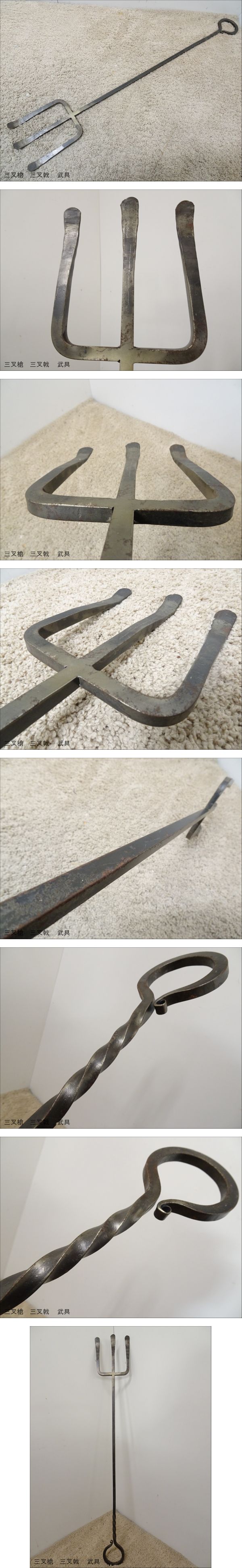 | 鉄製 三叉槍 三叉戟 武具 長さ108cm 重さ2kg/密教 法具 神像 仏象の出品です。 鉄製の三叉槍、三叉戟です。神像、仏象などの持物、武具・法具の1つとお聞きしております。 長さ108cm、重さ約2kgの見栄えのあるお品物です。 仏像・神像・密教法具・真鍮・金属製品などの多くを収集、コレクションされていた方から譲り受けたお品物になります。 インテリア・ディスプレー・コレクションにいかがでしょう。 なお、「三叉槍」以外の品物は商品ではございません。 譲り受けたお品物のため、詳しいお品物の情報、使用方法等は判りません。古いお品物ではないようです。写真でご判断できる方のみご入札ください。 ご入札後の取り消し、落札後のキャンセルはお断りいたします。十分にご検討頂き、ご入札を頂く様にお願い致します。 オークション終了より24時間以内にご連絡、ご連絡後2日以内にご入金・お支払いいただける方のみご入札ください。 ご連絡、ご入金いただけない場合は落札者都合でキャンセル・削除させていただきます。 ☆商品到着後、速やかに受け取り連絡をいただける方のみご入札ください。 ☆発送方法の変更、直接のお品物引渡しはしておりません。 当方専門ではないため詳しくはございません、タイトル内、説明等間違っている場合ございます。ご了承ください。また、譲り受けたお品物の為、購入時期・制作年代・正確な材質・その他詳細分かりません。現状渡し品になります、写真でご判断できる方のみご入札ください。ノークレーム・ノーリターンでお願いいたします。 ------状態------ 中古品になります。キズ・スレ・錆び・ヨゴレ・変色等あります。