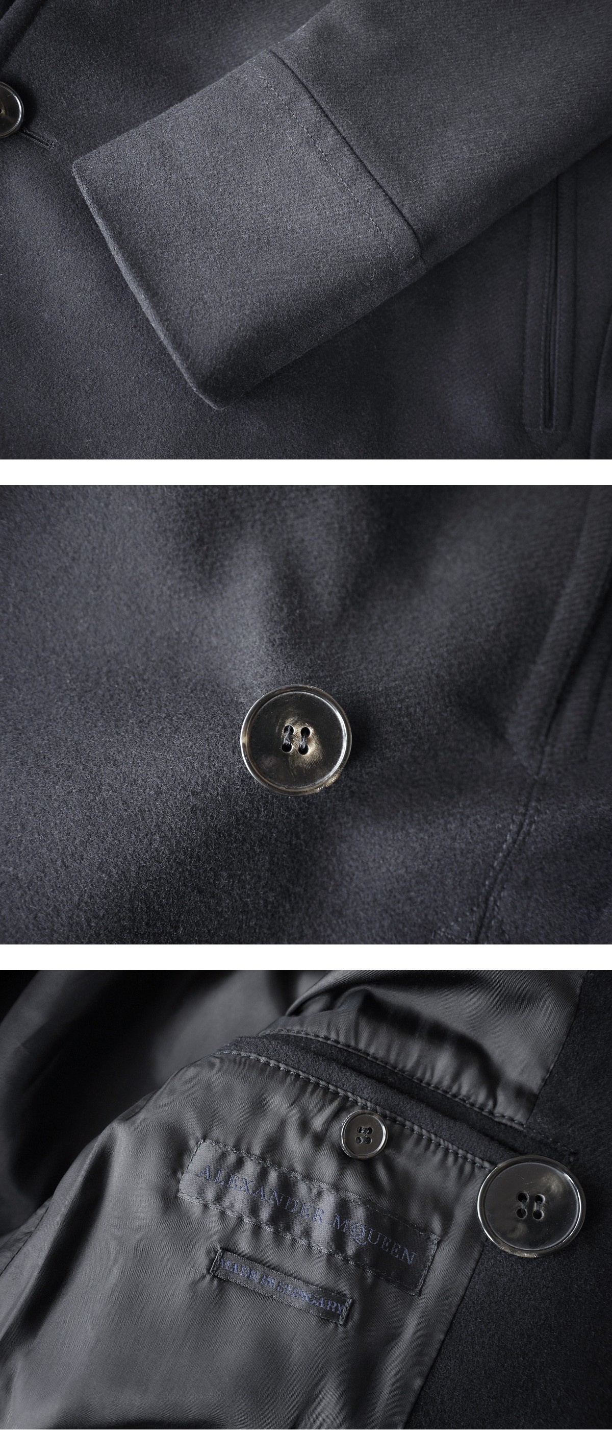 アレキサンダーマックイーンのカシミアブレンドウールメルトンダブルブレステッドコートでございます。マックイーンのお家芸とも言えるショルダーラインからウエストにかけての美しいエースラインのカッティングと、洗練されたミニマルデザインの大変完成度の高いウィンターコートです。 マックイーンらしいモードに傾倒したディテールで、ポケットとボタンの配置バランスやラペルの形状に至るまで、他に類を見ない独特の存在感を有する仕上がりでございます。カシミアを配合した上質なウールファブリックは、肌触りなめらかで、耐久性、機能性にも優れた一見して品質の良さを感じさせるマテリアルです。あまり出回らず、随所にマックイーンらしさを感じさせる逸品でございます。この機会にぜひよろしくお願いいたします。