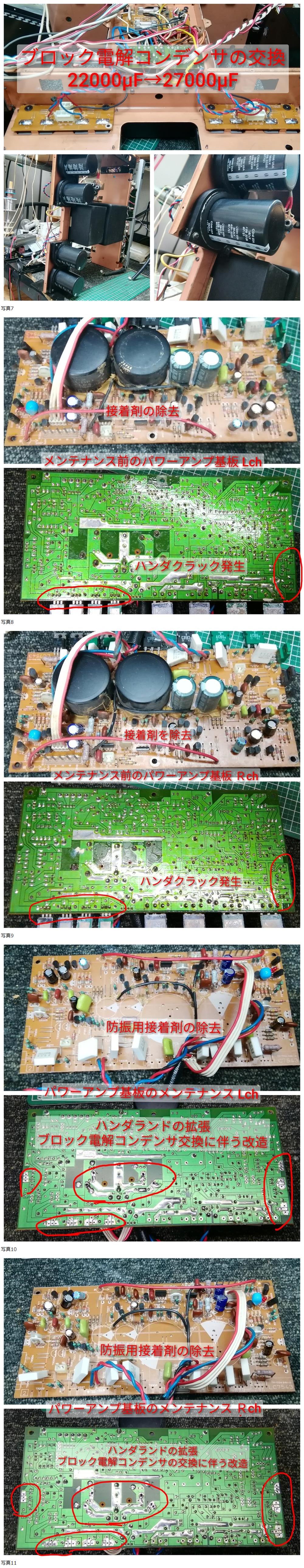 - パワーアンプ基板のA級側フィルターコンデンサーの防振用接着剤がパーツリード線の腐食を助長し断線に至る