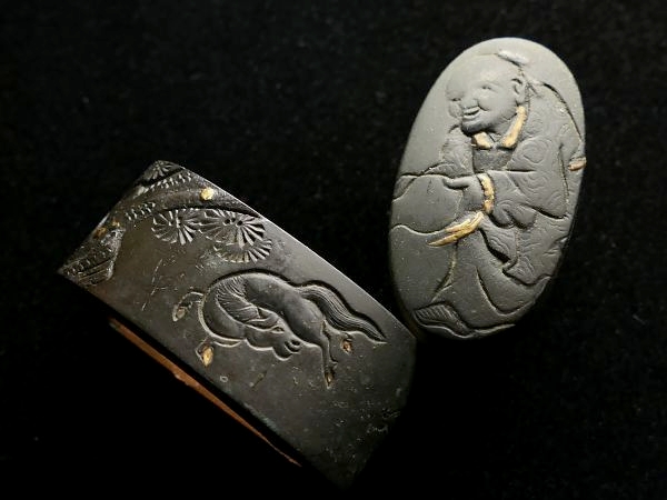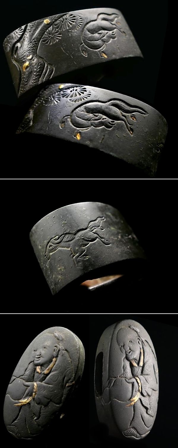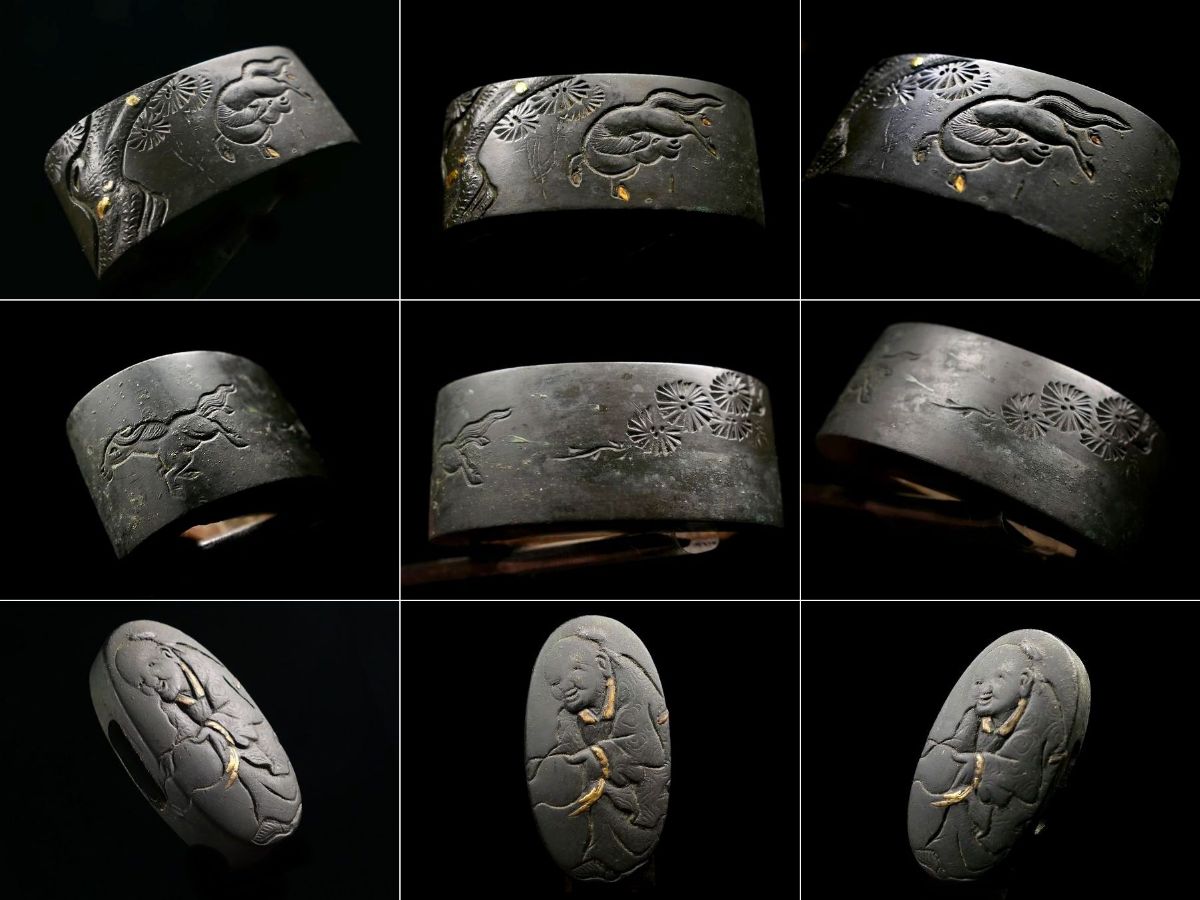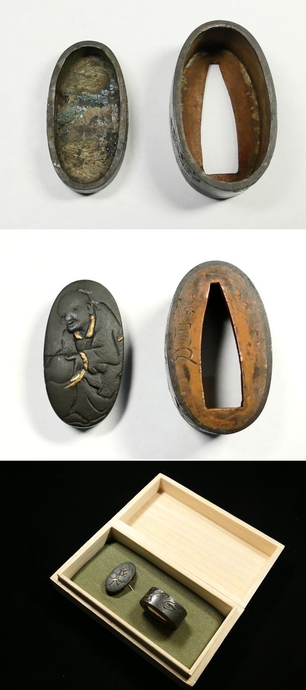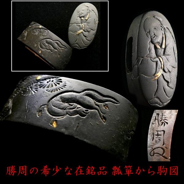 | 商品説明 | 金象嵌としっかりとした彫りにより 瓢箪を傾ける人物と 野を駆ける馬の図が施された 現存数の少ない明治金工「勝周」の作品です。 瓢箪を持った仙人と思われる人物と 走り回る馬が細工されているところから タイトルを「瓢箪から駒の図」とさせて頂きました。 画像にてご確認下さい。 明治に活躍した 「勝周」の希少な在銘品と存じます。 この機会に是非手に入れて下さい。 【しっかりとした彫り】 【見栄え良き金象嵌】 【雰囲気良き一品】 寸法: (縁) 約 3.75cm × 約 2.26cm × 約 1.58cm (厚み) (頭) 約 3.42cm × 約 1.80cm × 約 0.78cm (厚み) 材質: 赤銅地 桐箱付 銘 : 勝周 花押 状態:特に気になる傷みはなく良好。画像にてご判断下さい。 :許容範囲内の時代傷みはご理解下さい。 |