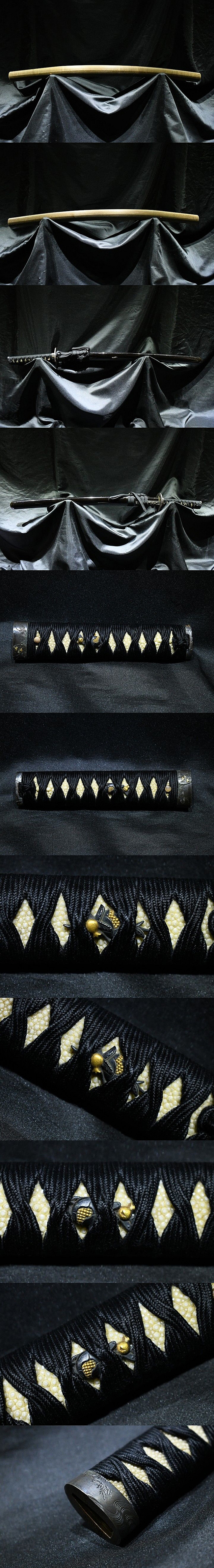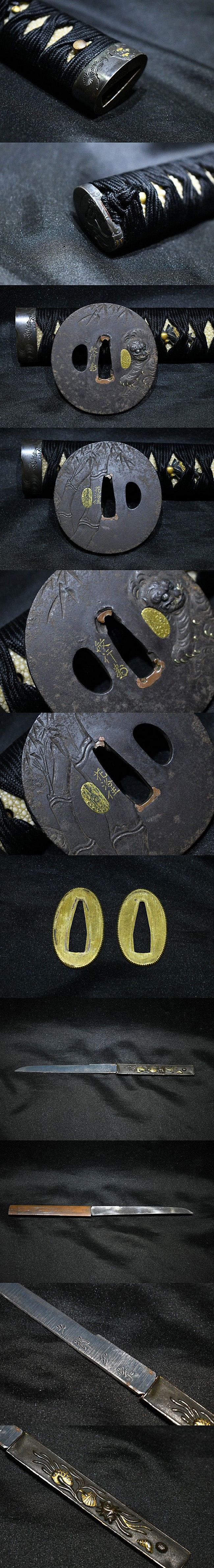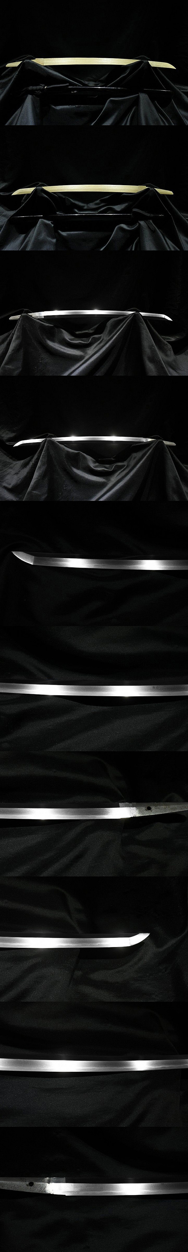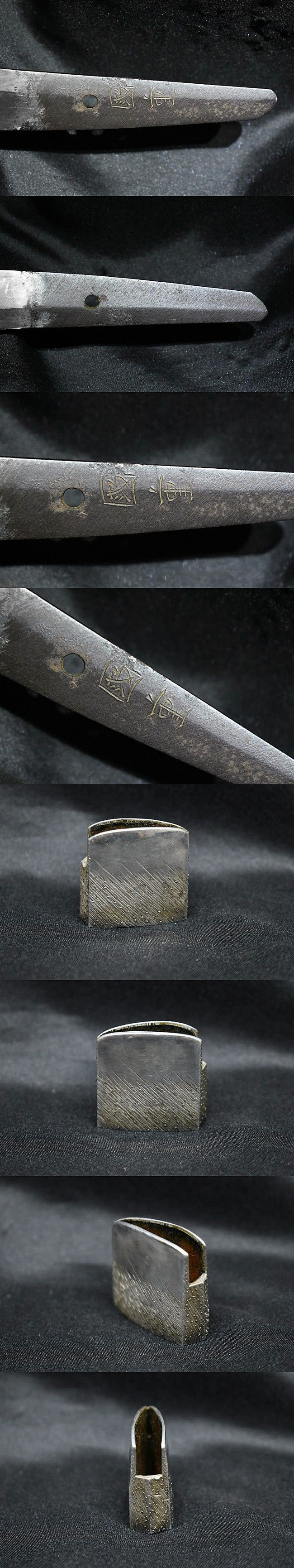 表【】 裏【】 種別: サイズ:長さ cm 反り: cm 目くぎ穴 個 元幅:約 cm 元重:約 cm 先幅:約 cm 先重:約 cm 刀身重量:約 g(ハバキ・柄をとった状態) ハバキ重量:約 g 鞘全長:約 cm |