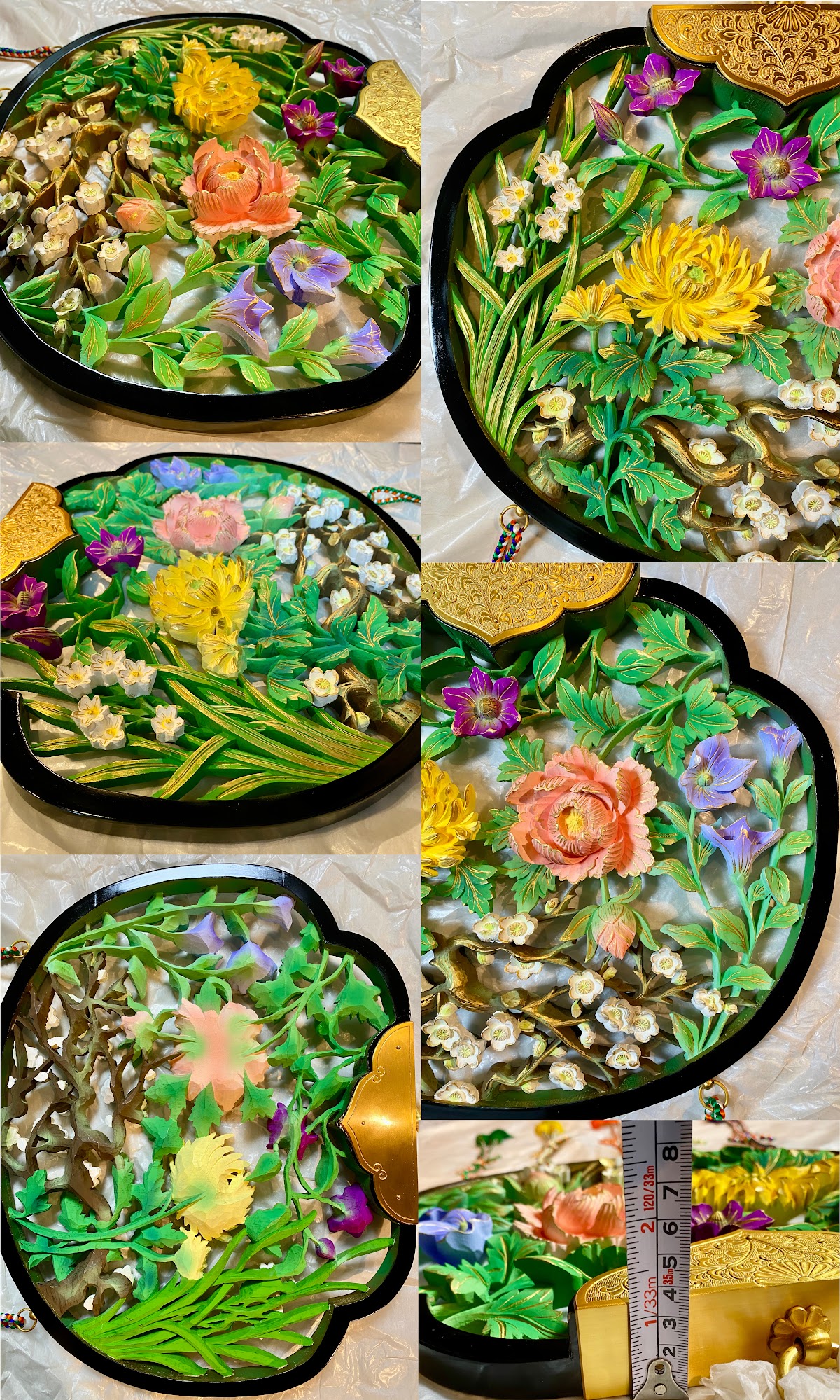 ●未使用品 木製 精密彫り 彩色 華鬘 正絹紐付き 1尺3寸サイズ 桐箱付きです。
