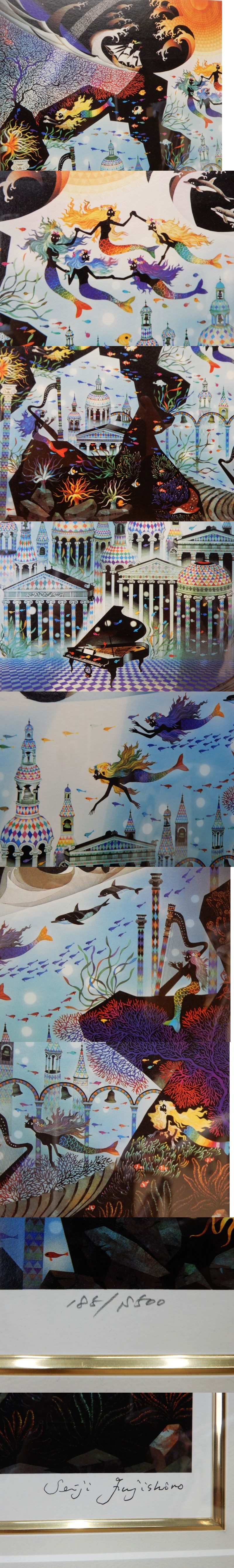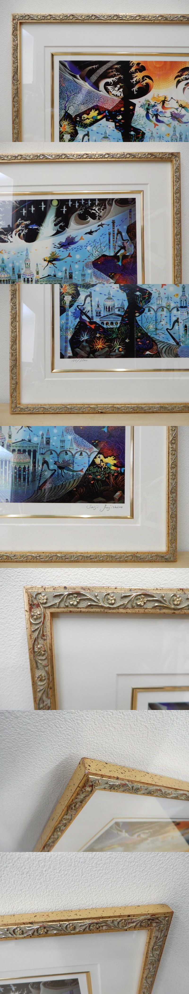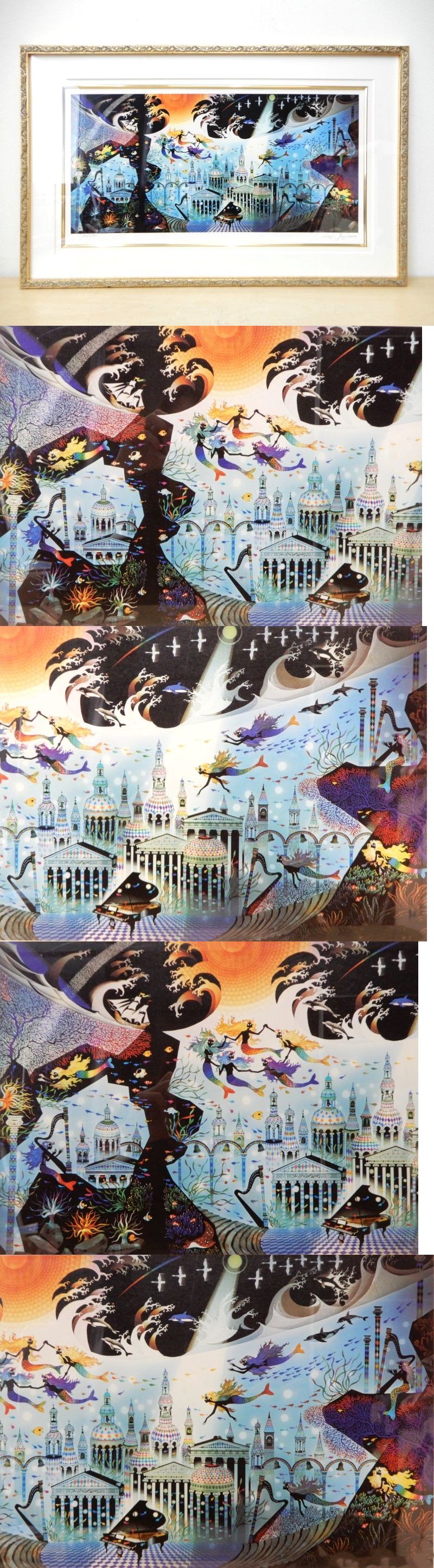 ○藤城清治『光る海』ダイヤモンド スクリーニング 版画 になります。 185/S500 ◆藤城清治 1924年 東京生まれ 1947年 慶應義塾大学経済学部卒業。人形と影絵の劇場「ジュヌ・パントル」を結成 1948年 「暮しの手帖」に影絵の連載を始める 1953年 朝日新聞に影絵を連載。NHKテレビ放送開始とともに、テレビに影絵の新しいジャンルを拓く 1966年 テレビ番組「木馬座アワー」のキャラクターに”ケロヨン”を創作 1982年 外務省派遣文化親善使節として、中東各地で、影絵劇「義経物語」他を上演 文化庁芸術祭で影絵劇「銀河鉄道の夜」他が優秀賞を受賞 1983年 影絵の絵本「銀河鉄道の夜」が、BIB国際絵本原画展で金のリンゴ賞を受賞 1989年 紫綬褒章を受賞 1995年 勲四等旭日小綬章を受賞 大きさ/(約) 額⇒横71.5×縦44.5×厚み1.5cm 画⇒横53.5×縦26cm ★絵画関連は多数出品中です! ・よろしければ他商品もご覧下さい!(クリックでページが開きます)→ 絵画関連一覧