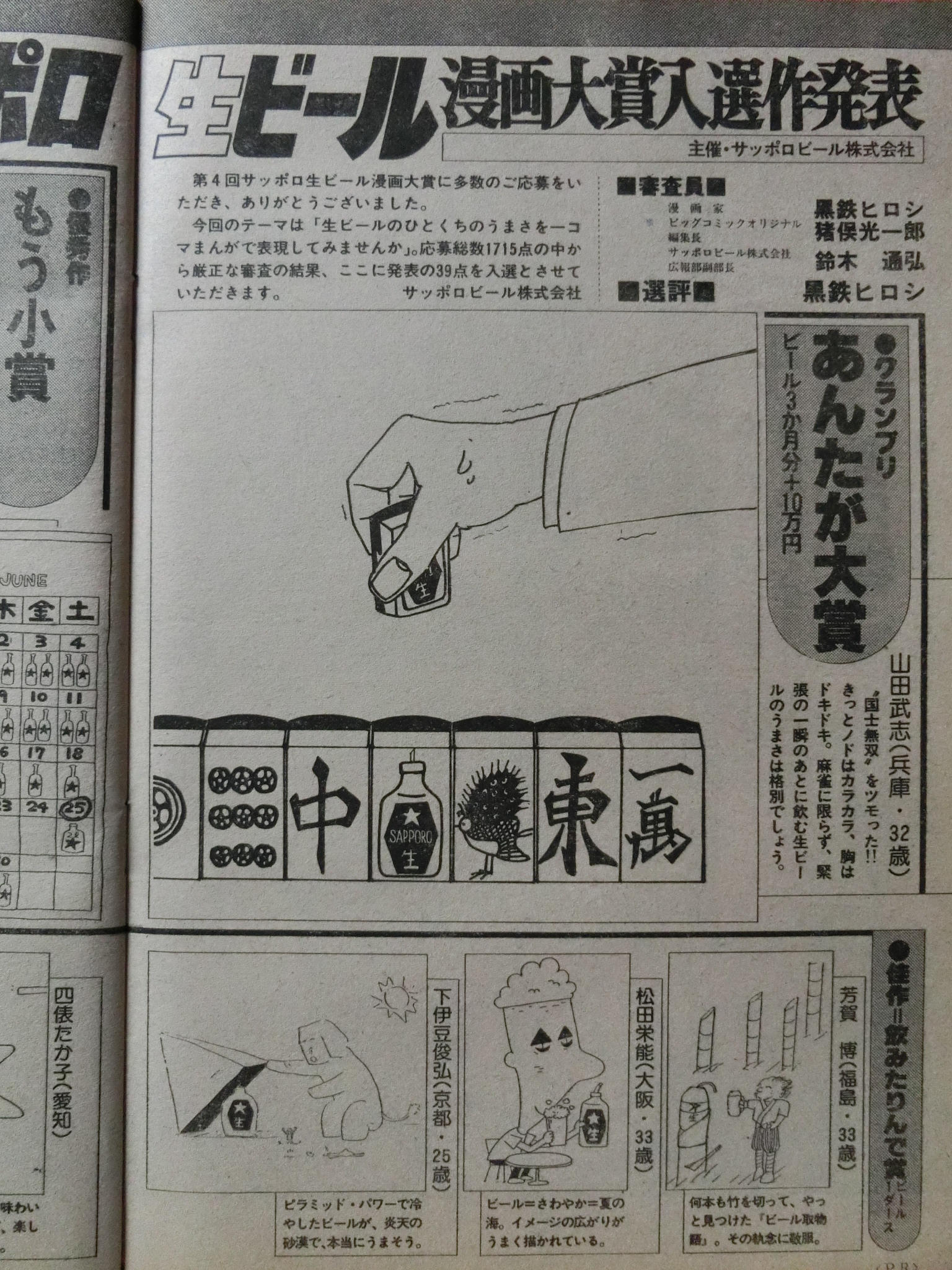 ビッグオリジナル 1983_昭和58年 9月 5日号 浅野温子22才,三田寛子17才,田尾安志29才,桜田善久19才,,弘兼憲史36才,三山のぼる27才,村松誠36才,白石勝彦,池尻克美,伊藤アシュラ,田山力哉53才 西岸良平36才,水島新司44才,北見けんいち43才,叶精作34才,篠原とおる47才,ジョージ秋山40才,木村えいじ40才,岩本久則44才,園山俊二48才,小島功55才,黒鉄ヒロシ38才,はらたいら40才 発売日 1983_昭和58年 9月 5日 (1983年) 発行 小学館 大きさ B5 1980_昭和55年からイラストレーター 村松誠さんが延々と現在進行中 表紙 小包風ハガキ ハガキは 70円だった イラスト 村松誠 36才 1947年生 表紙裏 ふそう大型 トラック 美女と野獣 地球がせまいね 三菱自動車 CM イラスト+写真 オリジナル・地震対策 レポート 135 ページ これを読んでいれば 東日本大震災時も 大丈夫だったはず グラビア 三田寛子 17才 花王トニック CM 1966年 1月27日 画 日暮修一 47才 1936年 - 2012年 4月13日 グラビア 田尾安志選手 29才 花王トニック CM 1954年 1月 8日 画 日暮修一 47才 1936年 - 2012年 4月13日 グラビア サッポロ生 ひとくち ああ、ひとくちの極楽 CM ビッグオリジナル 1983_昭和58年 8月 5日号 第4回”ちょっと一杯”争奪 130ページ サッポロ 生ビール 漫画大賞 入選作発表 130ページ 山田武志 32才 あんたが大賞 兵庫県 131ページ 大鐘則夫 26才 もう少賞 埼玉県 269 ページ オリジナル 17 パズル 読物・イラスト・写真・カット シネマ/シネマ 田山力哉 53才 の一言評 1930年 6月 1日 - 1997年 3月23日 133ページ 浅野温子 22才 陽暉楼 1961年 3月 4日 釣々発止 白石勝彦 イラスト 伊藤アシュラ 76ページ 秘伝直伝 宝の湖に 魅せられて ゴミの山を越える ああ!! 熱球時代 88 カット 池尻克美 203ページ 野球浪人 桜田善久 19才 駒大受験失敗 南海ホークスキャンプでアルバイト バード 118 寄鳥見鳥 岩本久則 44才 1939年 3月 271ページ アリスイ ウトナイ湖 エサはアリのサナギ 北海道 読切連載 31頁~ 頁 三丁目の夕日 西岸良平 No. 216 36才 1947年 7月30日 179頁~ 頁 あぶさん 水島新司 No. 246 44才 1939年 4月10日 77頁~ 頁 釣りバカ日誌 北見けんいち No. 96 43才 1940年12月11日 103頁~ 頁 魔物語・愛しのベティ 叶精作 No. 60 34才 1949年 1月26日 3頁~ 頁 やどかり 篠原とおる No. 61 47才 1936年 4月28日 47頁~ 頁 浮浪雲 ジョージ秋山 No. 231 40才 1943年 4月27日 147頁~ 頁 とねっ娘 木村えいじ No. 41 40才 1943年 2月24日 岡山県英田郡美作町(現在の美作市)出身 オリジナル・シリーズ 増刊号から本誌初登場 209頁~232頁 幸福ブイヨン 震度2・2 三山のぼる No. 27才 1956年 1月 7日 - 2007年12月 2日 jpgファイル24枚 241頁~268頁 人間交差点 あだしの 前編 弘兼憲史 36才 1947年 9月 9日 jpgファイル28枚 一流ナンセンス 99頁~ 頁 くたばれギャートルズ 園山俊二 No. 73 49才 1935年 4月23日 - 1993年 1月20日 143頁~ 頁 ヒゲとボイン 小島功 No. 55才 1928年 3月 3日 - 2015年 4月14日 ビッグオリジナル 1983_昭和58年 7月 5日号 236ページ 美女は世につれ 世界にただ一人、 そんな存在感を持った女 小島功 272頁~ 頁 赤兵衛 黒鉄ヒロシ No. 38才 1945年 8月 3日 270頁~ 頁 ナ~ンセンス はらたいら No. 157 40才 1943年 3月 8日 - 2006年11月10日 古本です。 神経質な方の入札はご遠慮ください。 背表紙の一部(ホッチキス部分)や本の中等をセロテープやボンドで補修している本もあります。 経年による劣化(すれ、ヤケ、シミ、折れ、小さい破れ、汚れ等)があります。 落書き、ページ割れ,ページ抜け、見落とし等が、あるかもしれません。 気になる点などあれば、事前に質問して下さい。 この商品の発送後は、クレーム、返品は、お断り致します。
