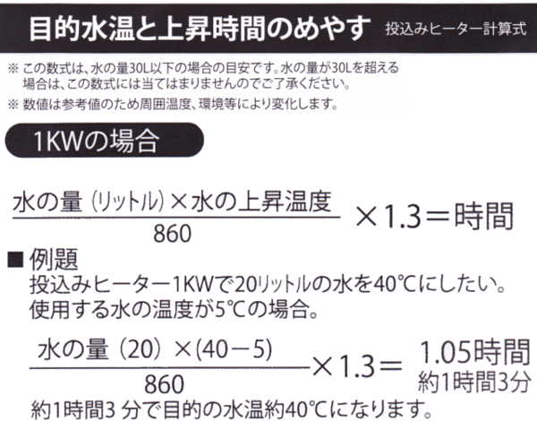 | 商品説明 | 温度調節ダイヤルで一定の温度にセットできます。 5度の水20リットルを40°にするのに約1時間かかります。(※参考値) |
