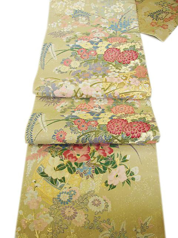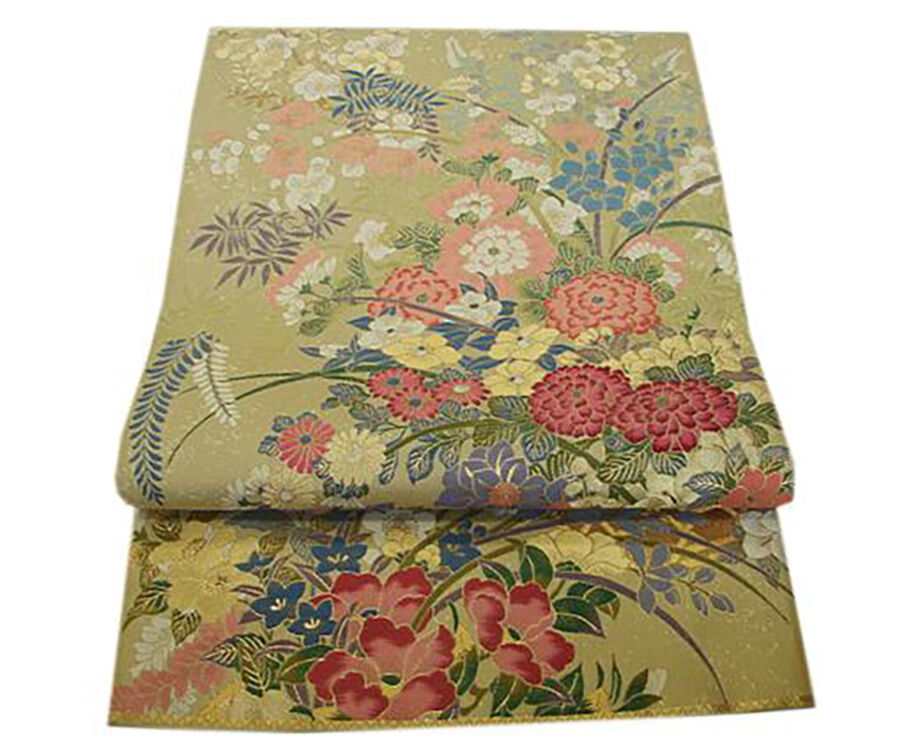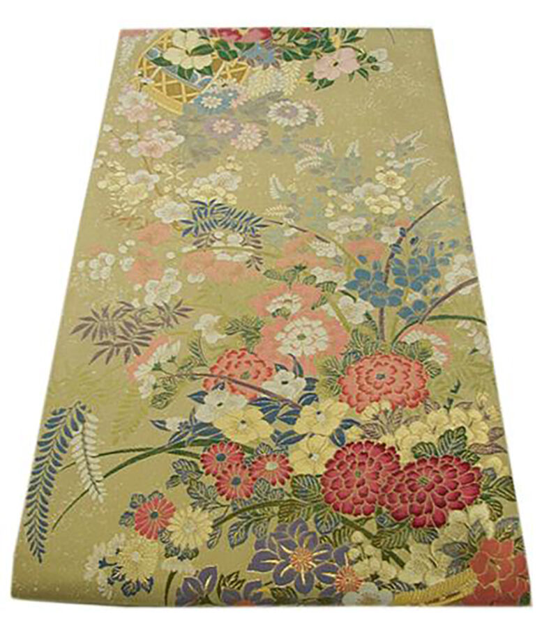 | 商品説明 | とてもしなやかな手触りの扱い易く結び易い袋帯。 渋い枯色地に金糸や桜、白、青藤、緑色等の花籠文や四季の花木の織柄。 六通柄。 |