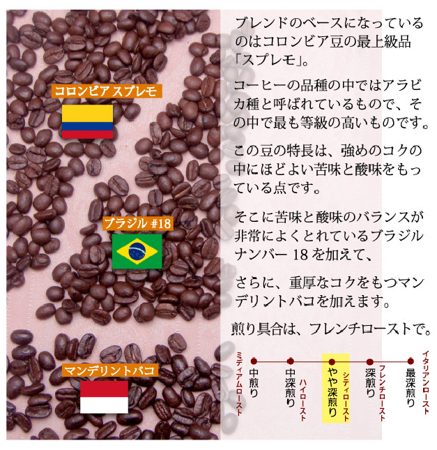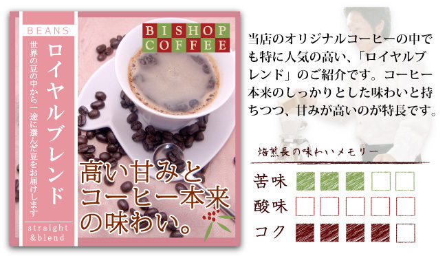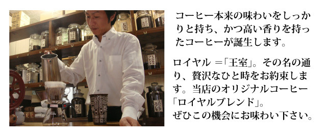 贅沢な気分を味わいたい貴方にお勧め! 当店オリジナルブレンドの中で特に人気の高い「ロイヤルブレンド」苦味、香の高さ、まろやかな酸味が特長の最高級ランクコロンビアをベースにブラジル、クリアな苦味と豊かなコクが堪能できるマンデリンをブレンドして仕上げたその味わいは納得と満足をお約束します。ロイヤル Royal=「王室」という意味。その名の通り、贅沢なひと時をお過ごし下さい・・・。